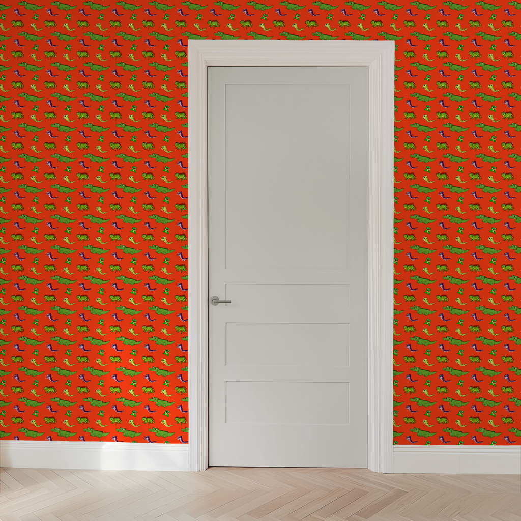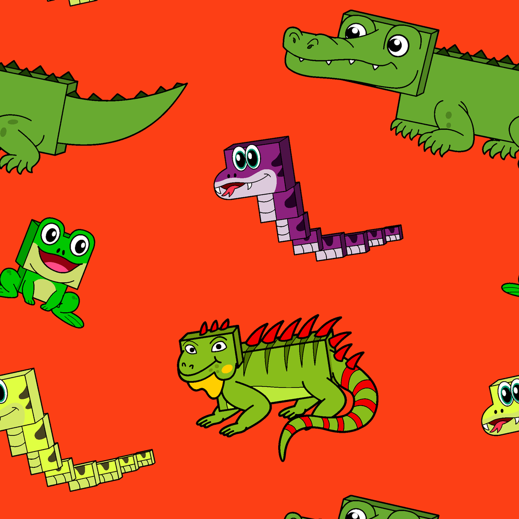 Bright, English Tree cartoon reptiles including alligators, lizards, and pixelated snakes on a vibrant red background. Perfect for children's rooms or nurseries.