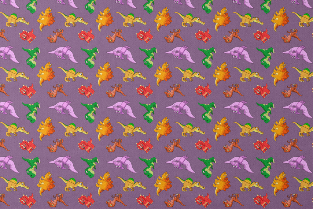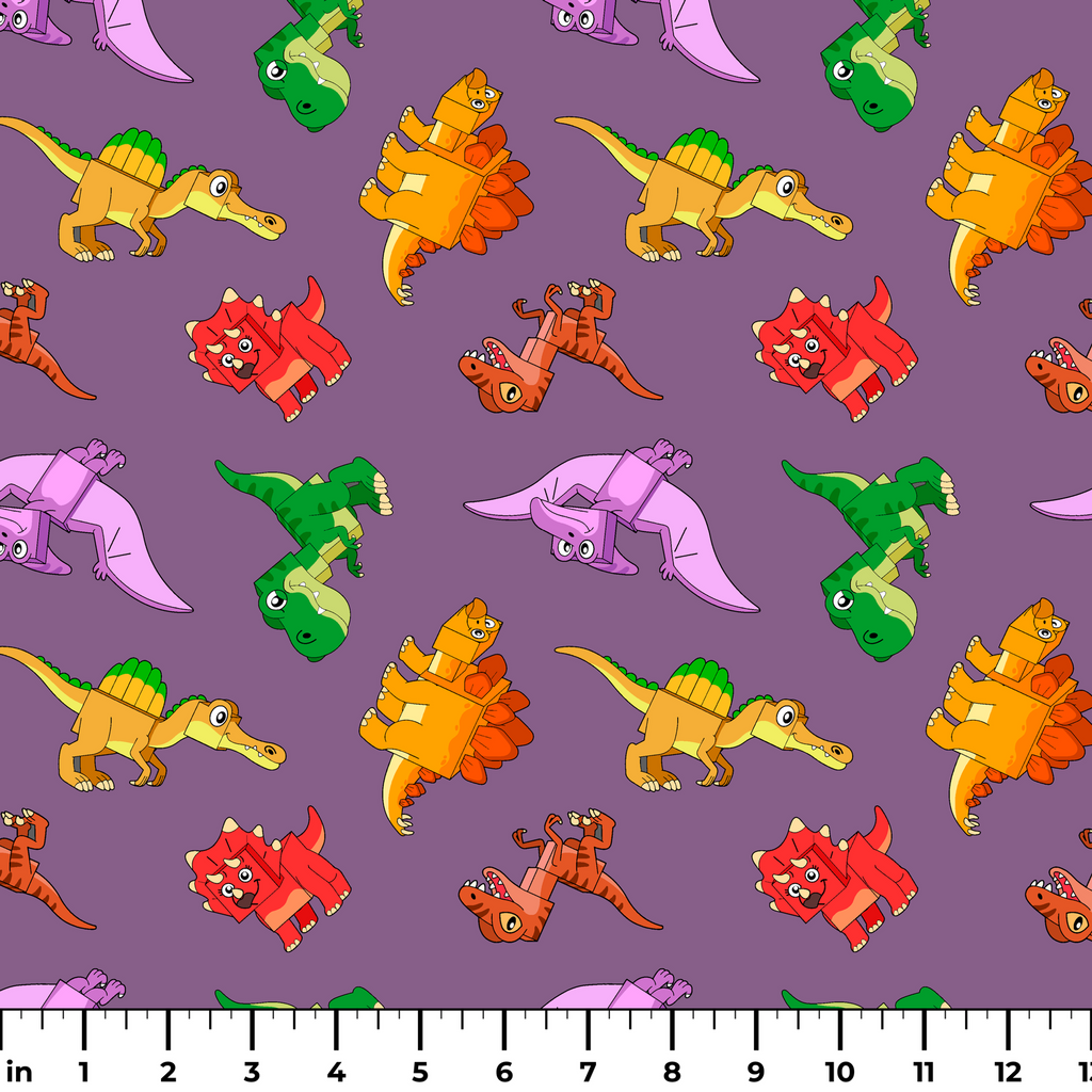 English Tree Colorful Cartoon Dinosaurs on Purple Fabric
