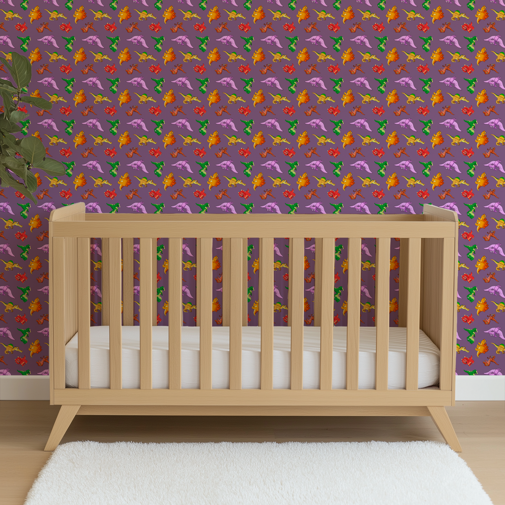 English Tree Colorful Cartoon Dinosaurs on Purple Wallpaper