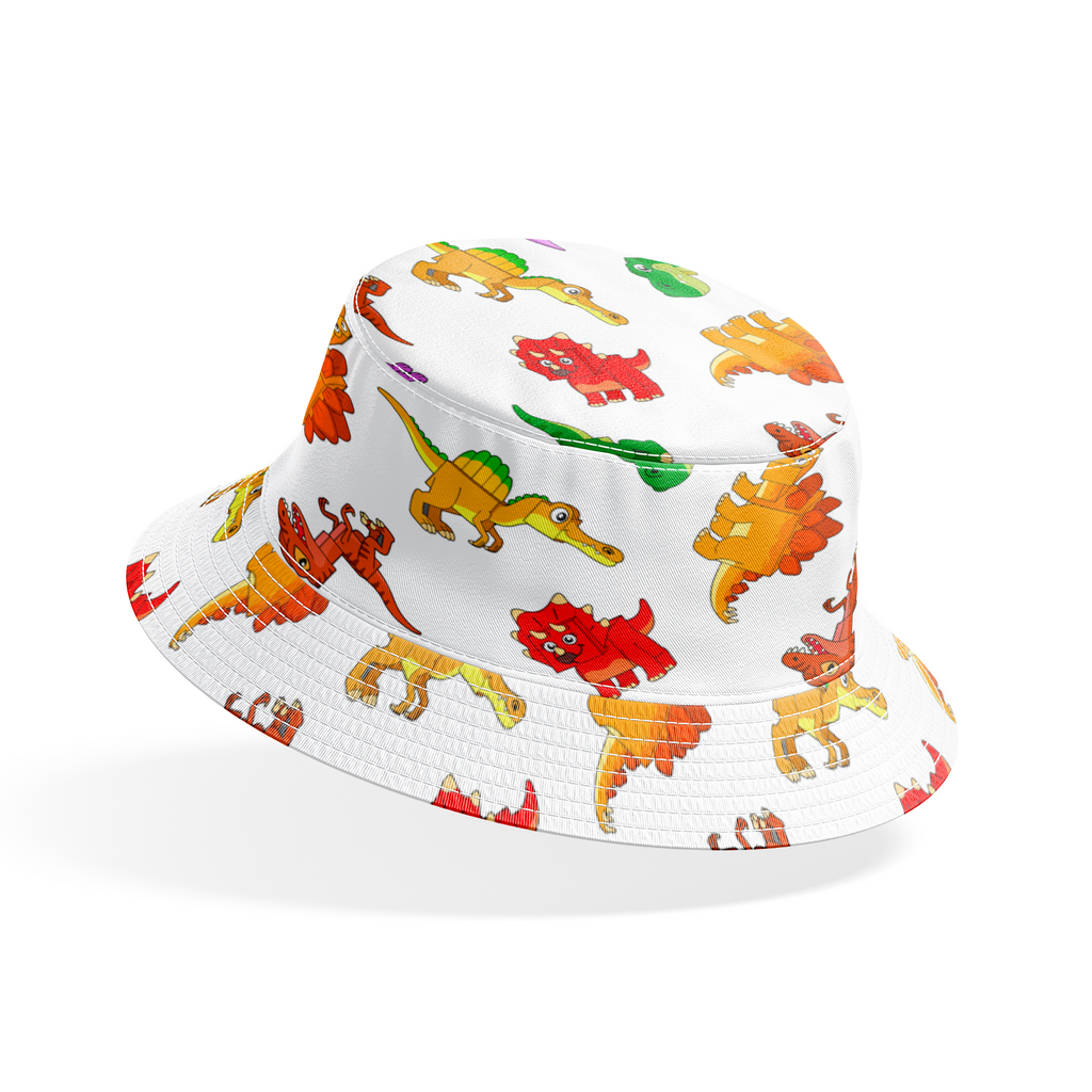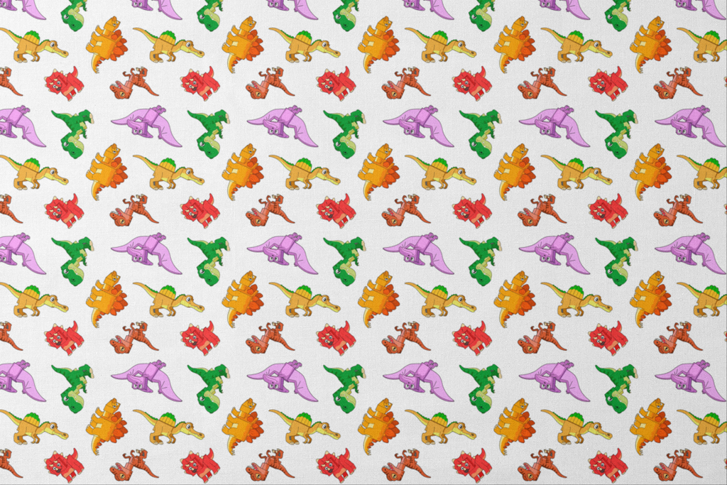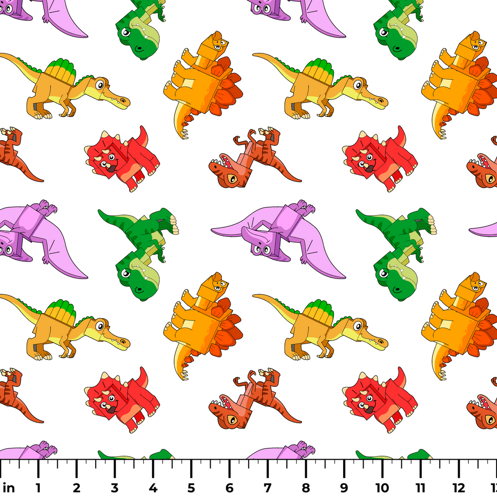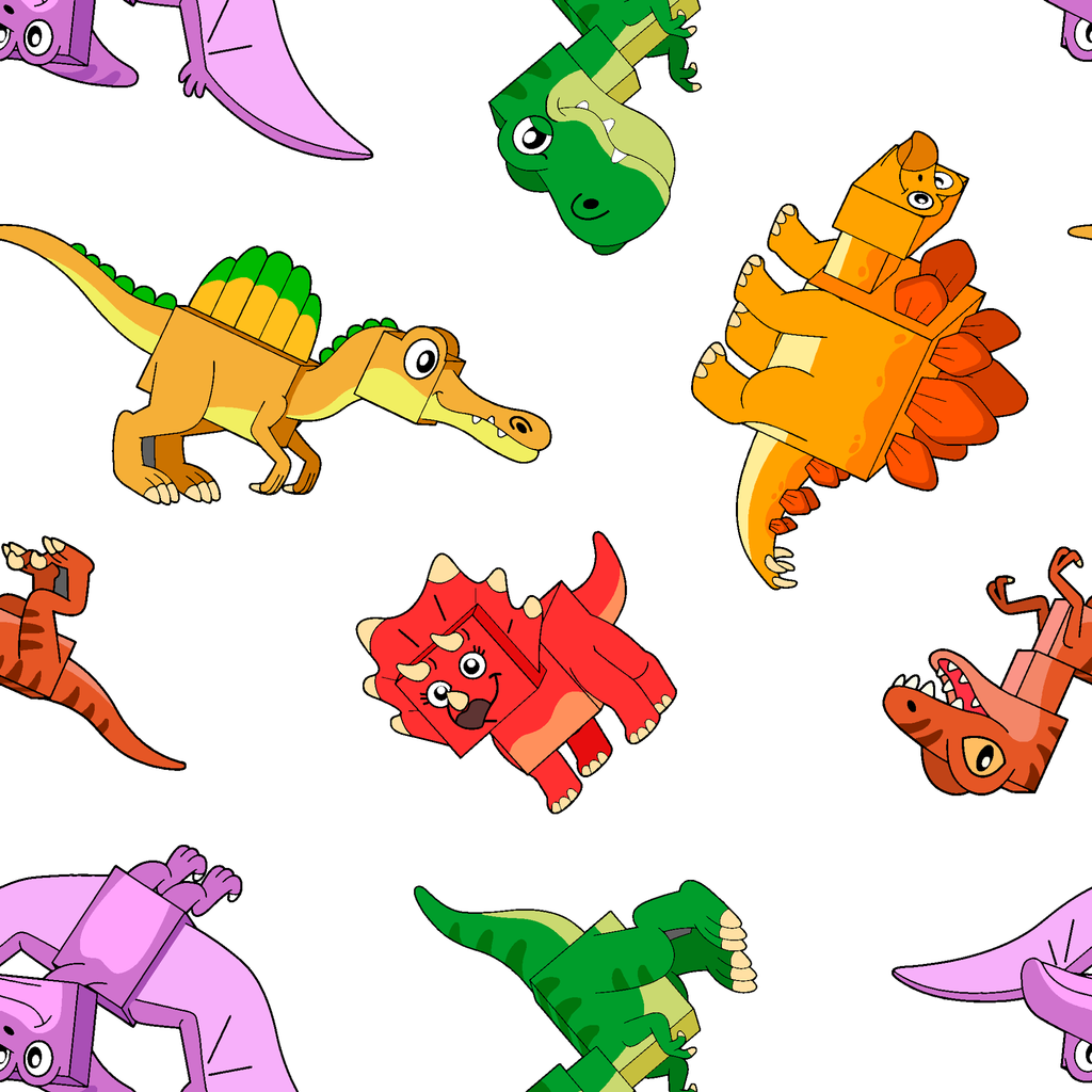 Colorful English Tree cartoon dinosaurs pattern featuring adorable T-Rex, Stegosaurus, Spinosaurus and Triceratops in vibrant red, orange, green, purple and brown colors. Perfect for kids' rooms and crafts.