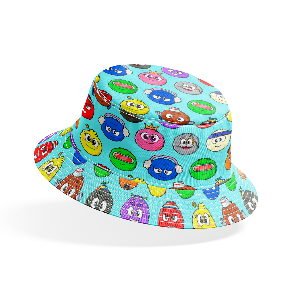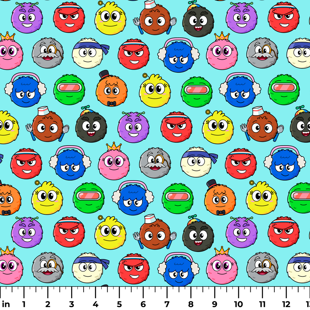 Vibrant cartoon English Tree fuzzies faces pattern in bright colors with expressive emotions - perfect for kids' apparel, featuring red, blue, yellow, and pink characters with silly expressions on a light blue background.