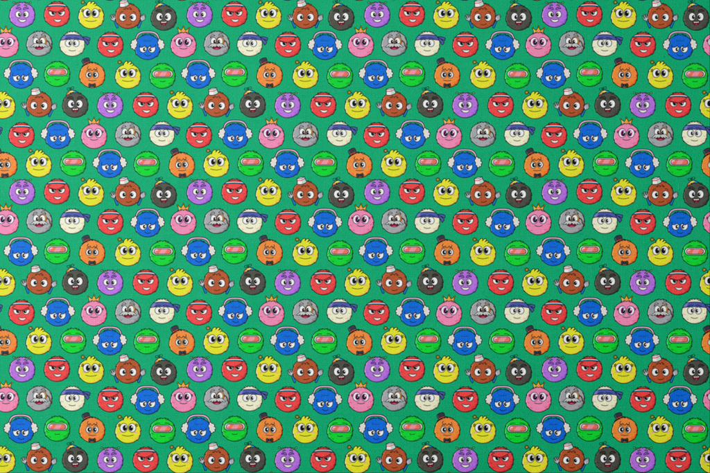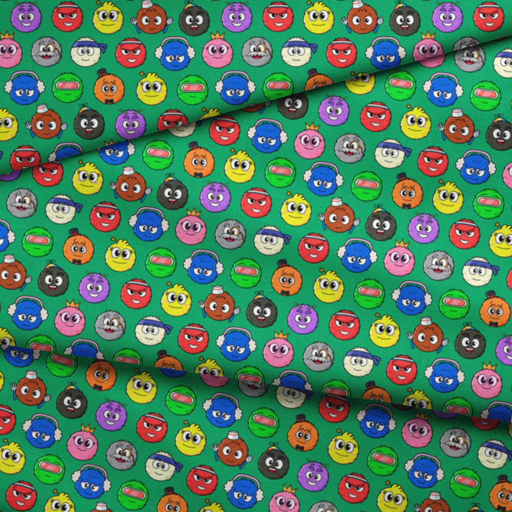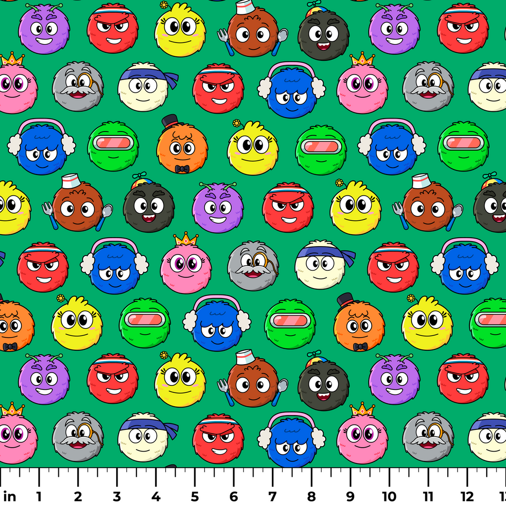 Colorful English Tree fuzzies cartoon character faces on a green background featuring various emotions with red, blue, yellow, and purple round expressions - perfect for children's apparel or bedroom decor.