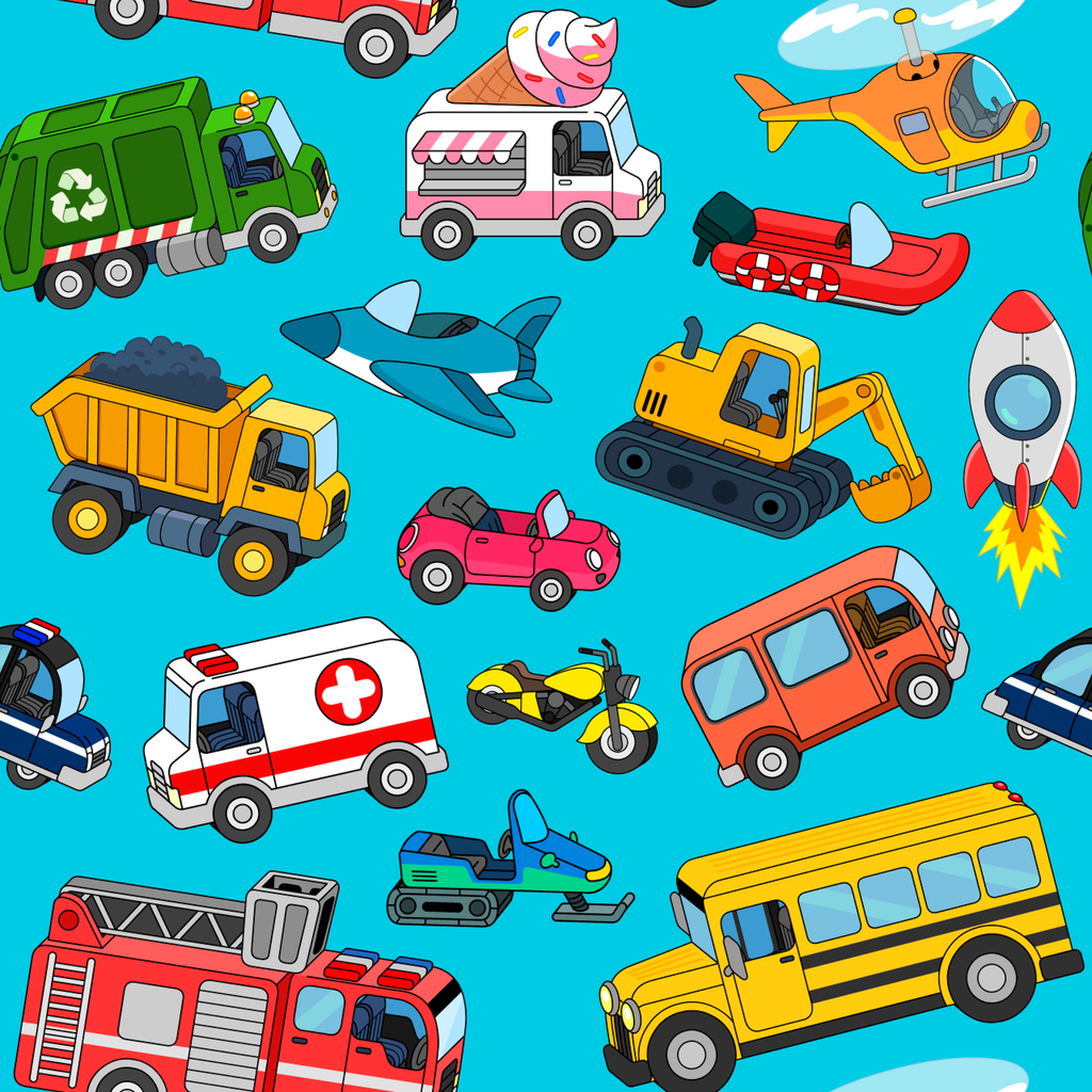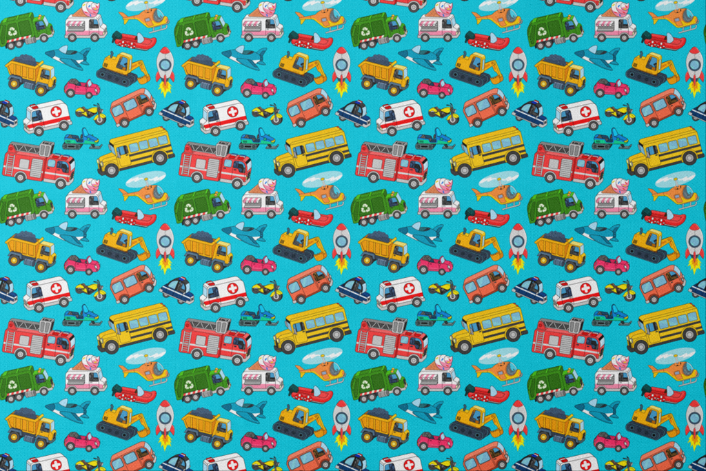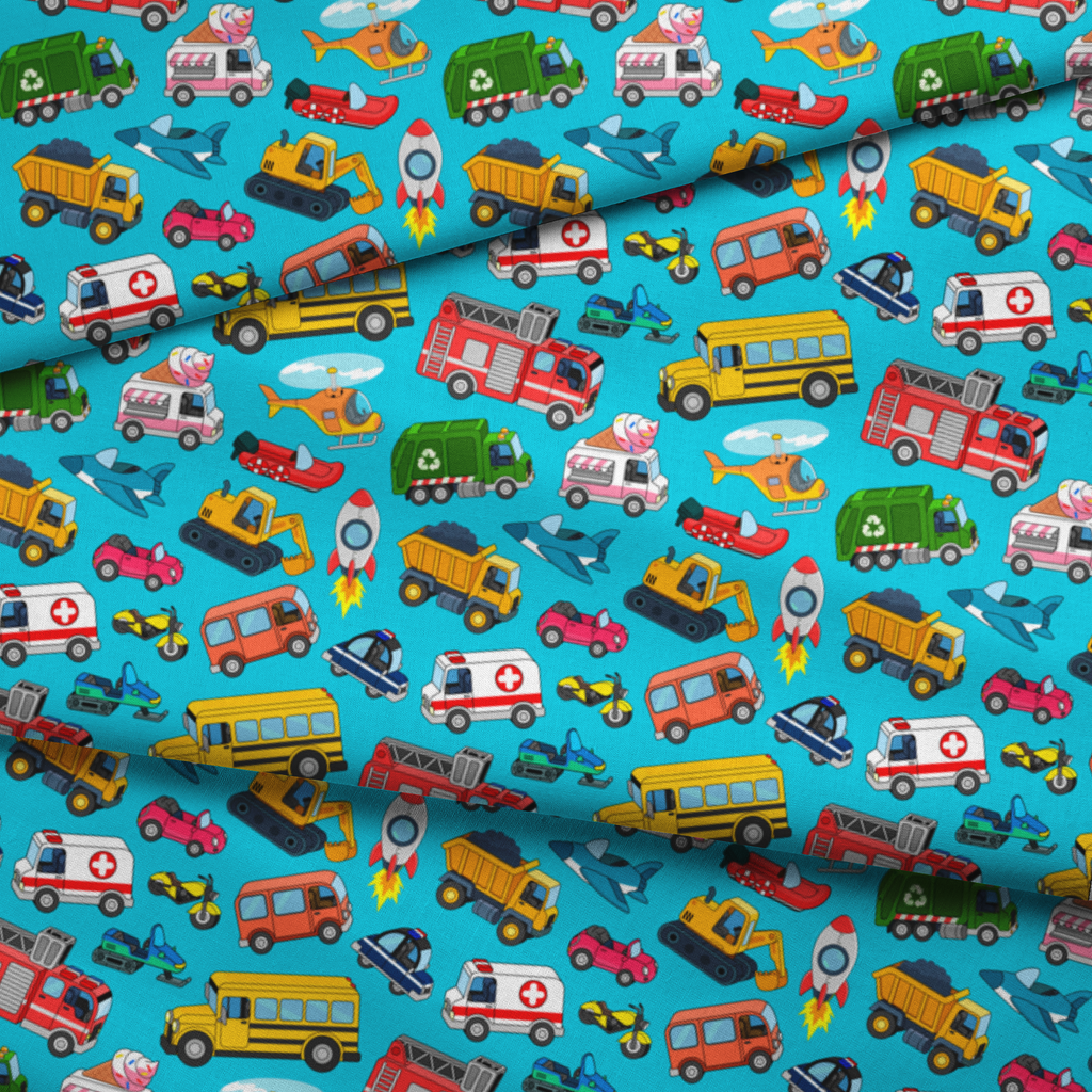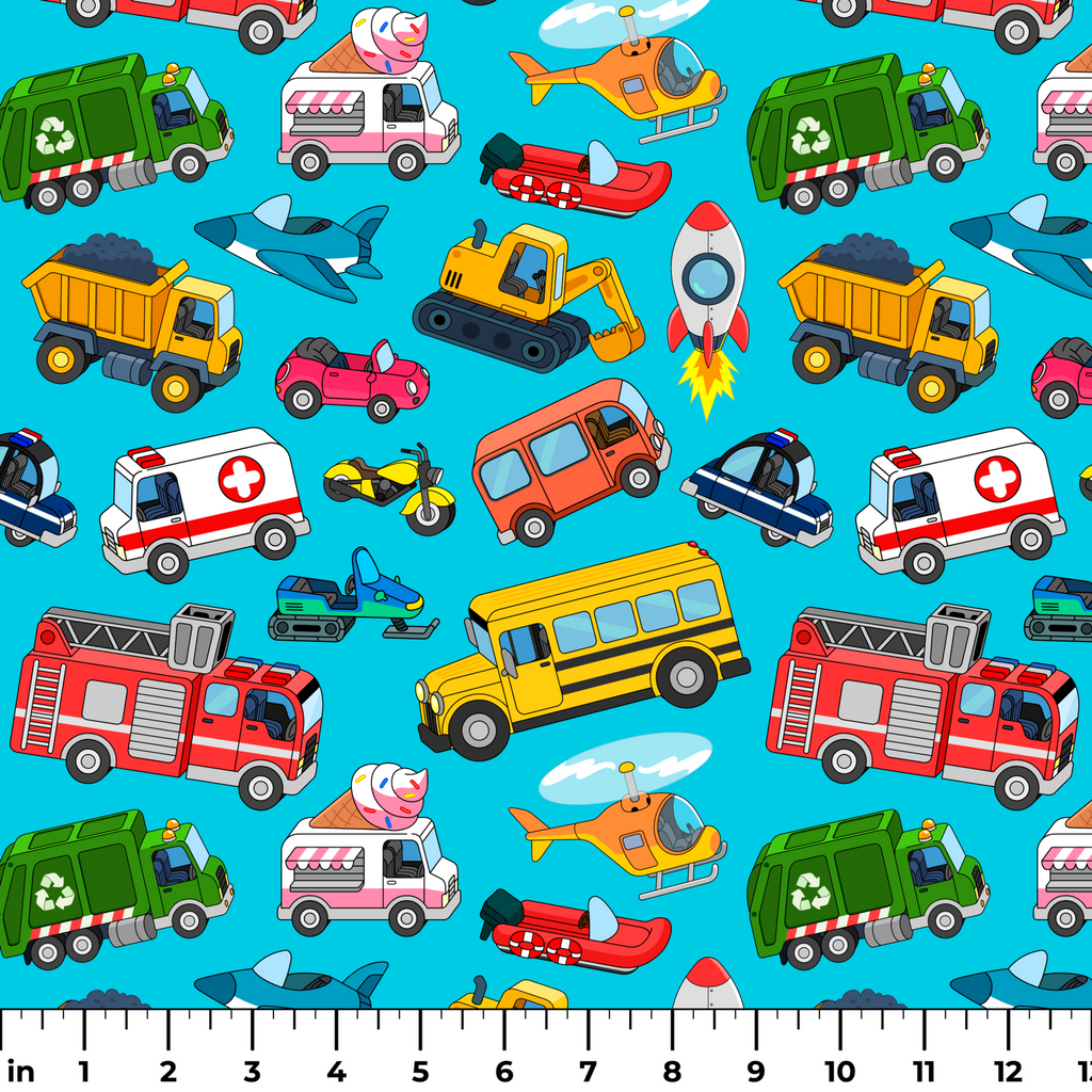 Adorable English Tree transportation pattern featuring colorful vehicles including a school bus, fire truck, ambulance, dump truck, excavator, helicopter, and rocket ship on a bright blue background.
