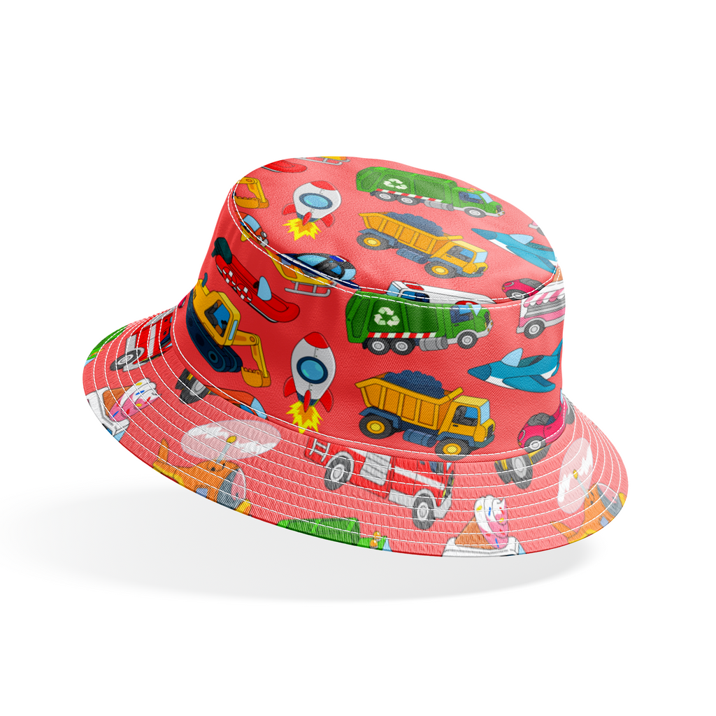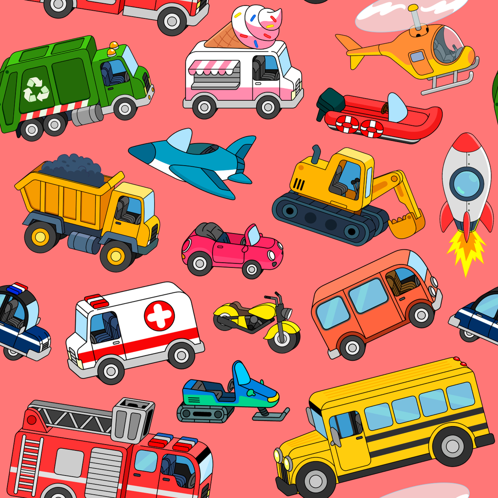 Vibrant English Tree collection of colorful vehicles on a red background including trucks, ambulance, school bus, fire engine, and construction equipment - perfect for kids crafting and room decor.