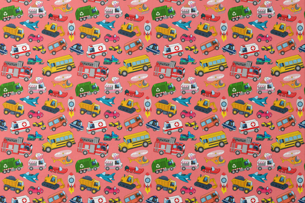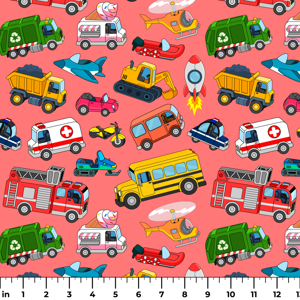 English Tree Colorful Transportation Vehicles on Red Fabric