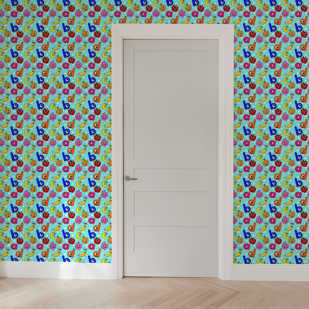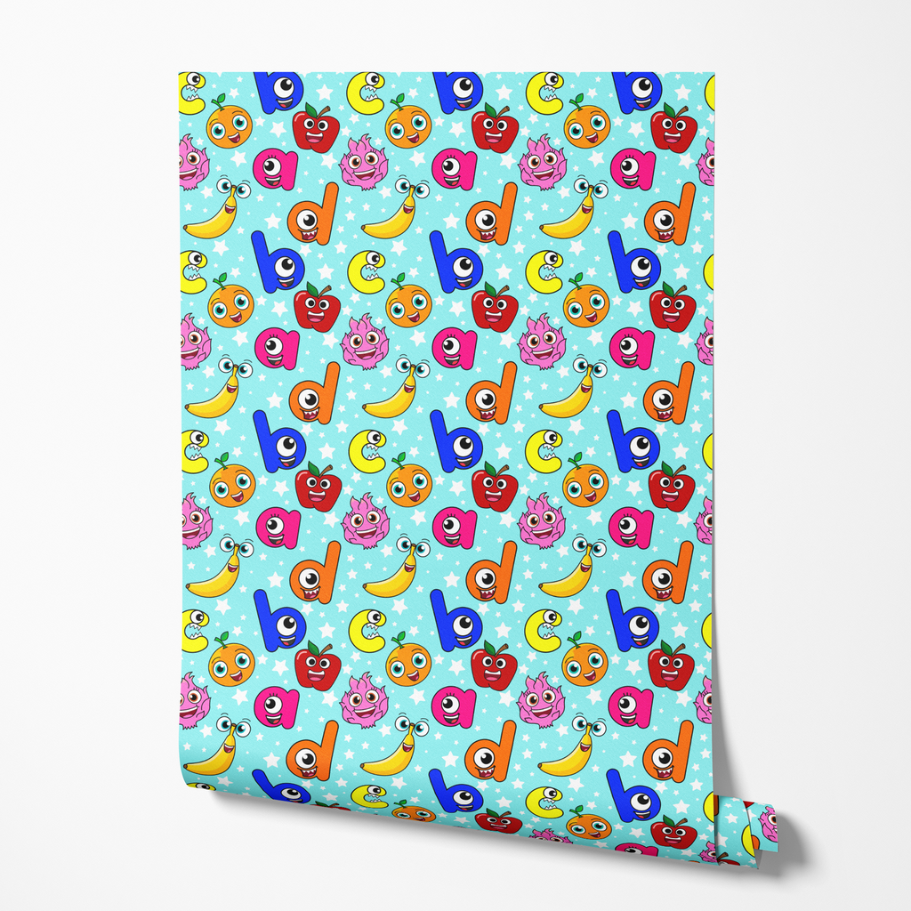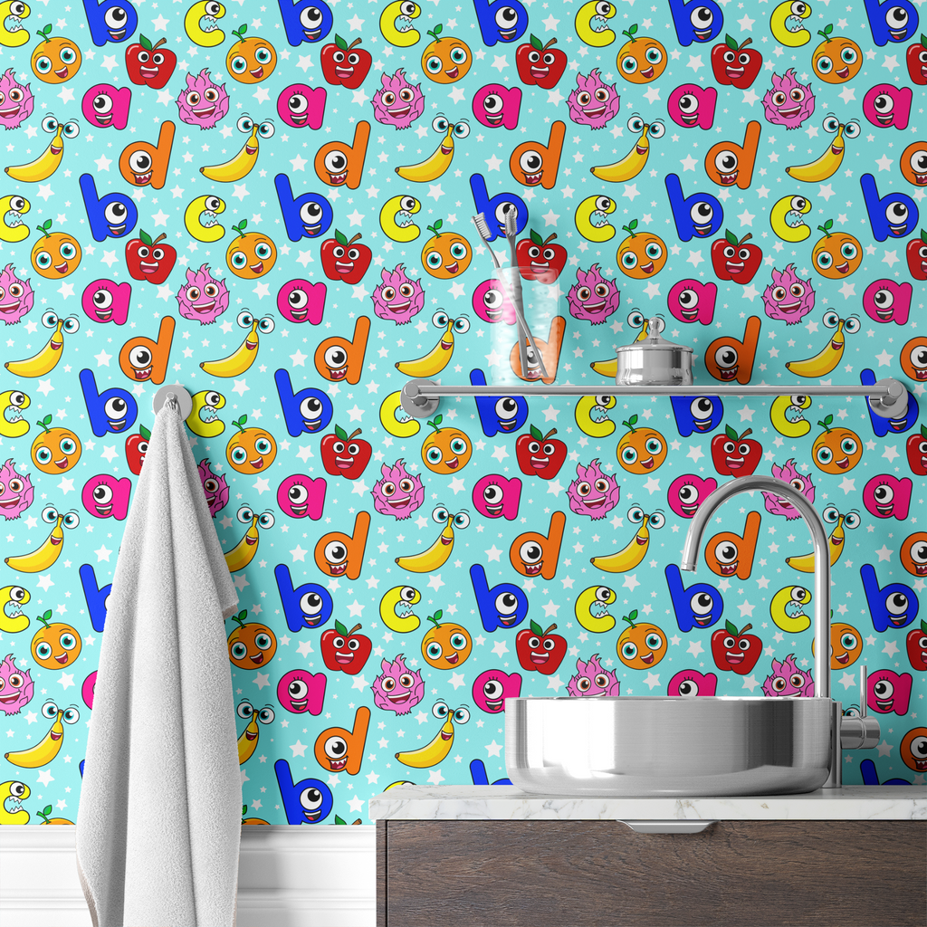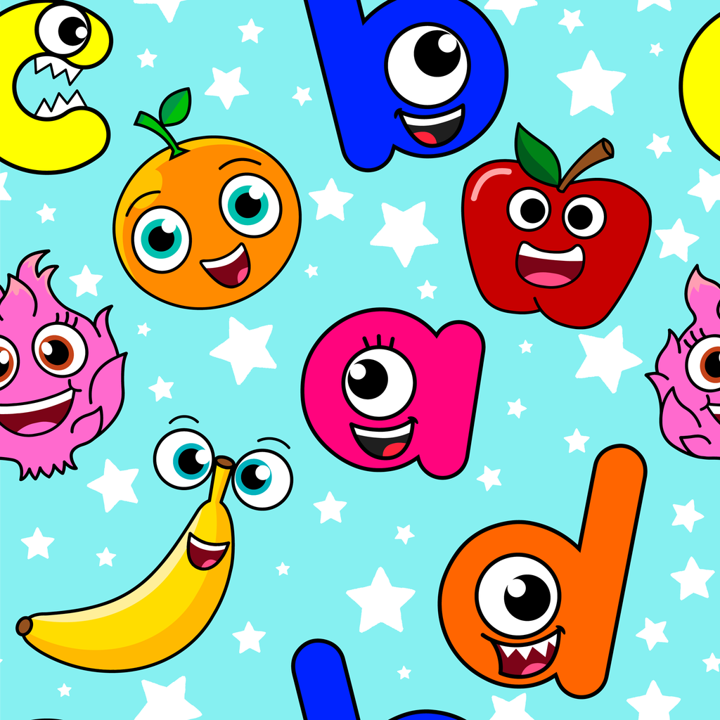 Colorful English Tree cartoon fruit and letter characters with expressive faces on a light blue starry background. Perfect for children's rooms or nurseries.