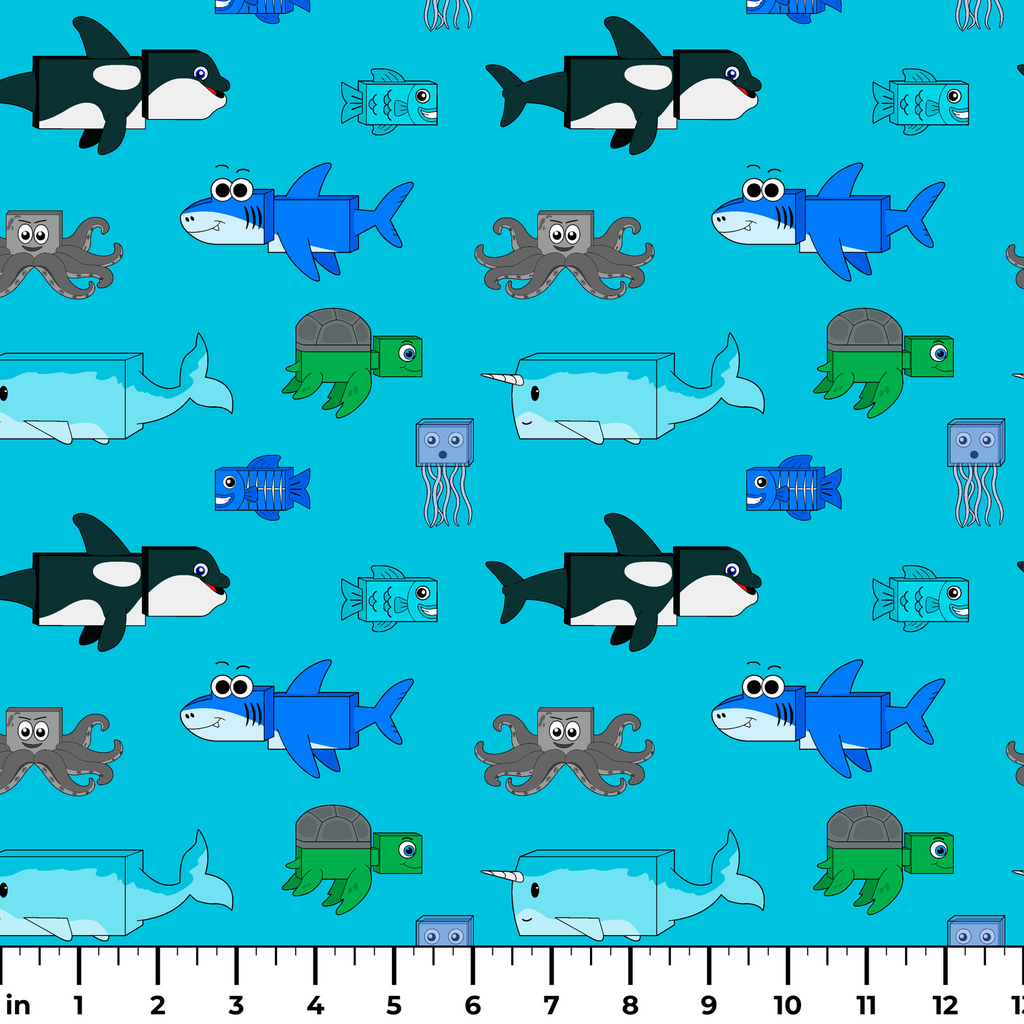 Playful English Tree sea creatures featuring sharks, octopus, and fish in vibrant blues and greens on a light blue background - perfect for children's crafts or ocean-themed decor.