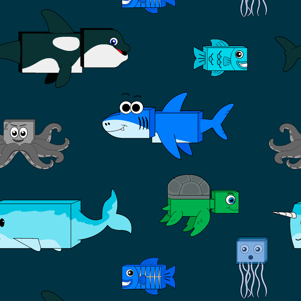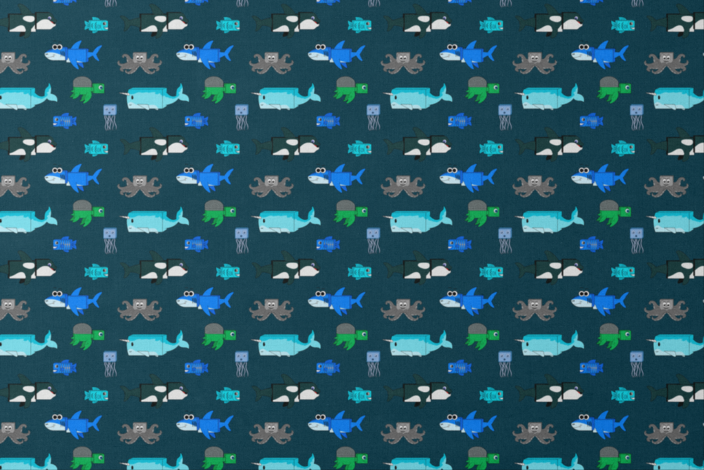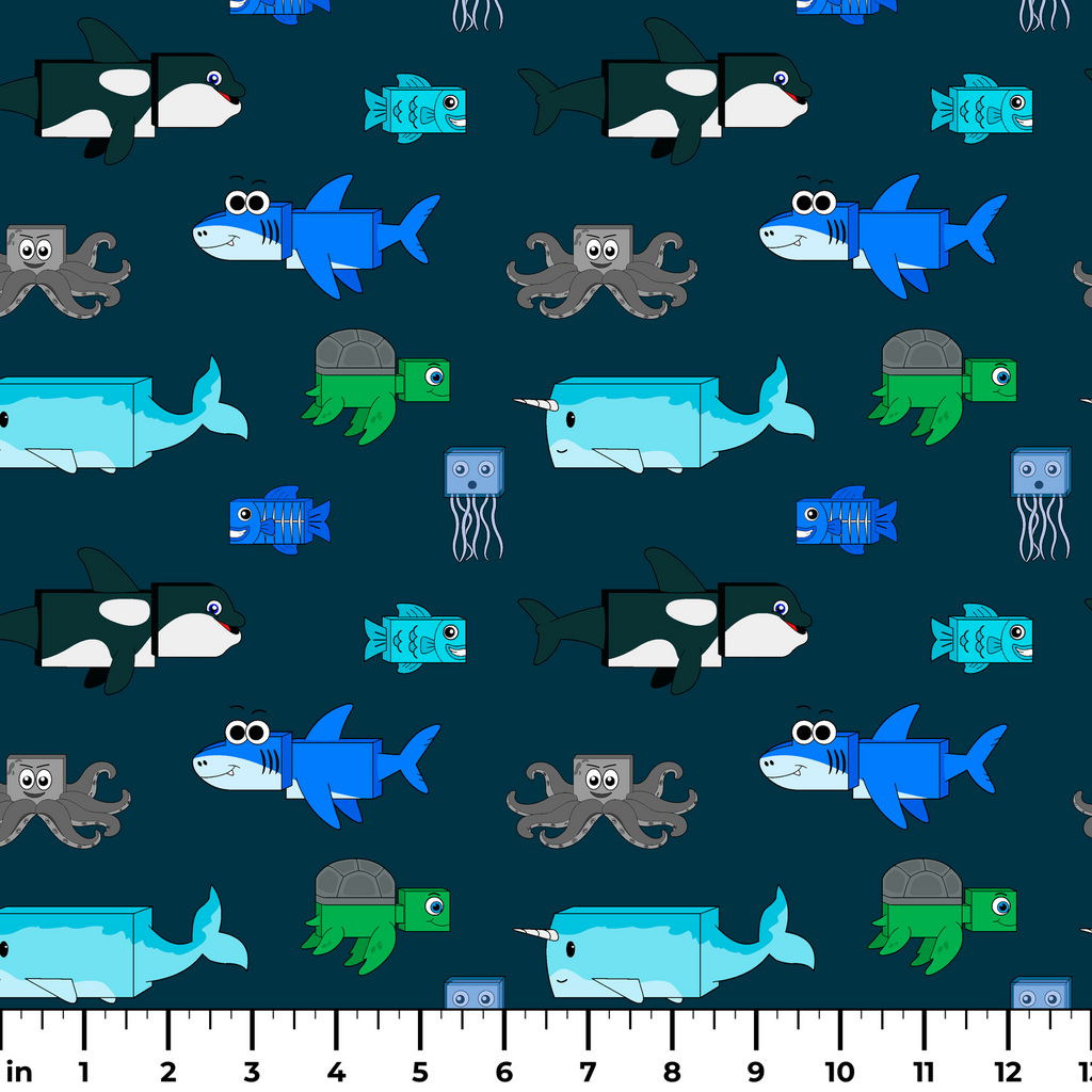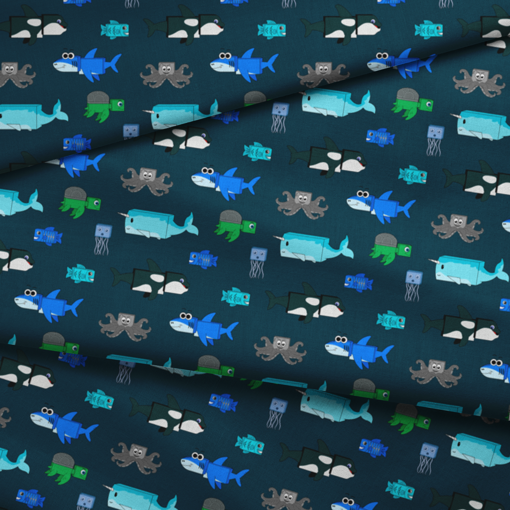 Adorable English Tree cartoon sea creatures in a modern, playful pattern featuring colorful sharks, octopuses, and whales rendered in vibrant blues and greens against a navy background.