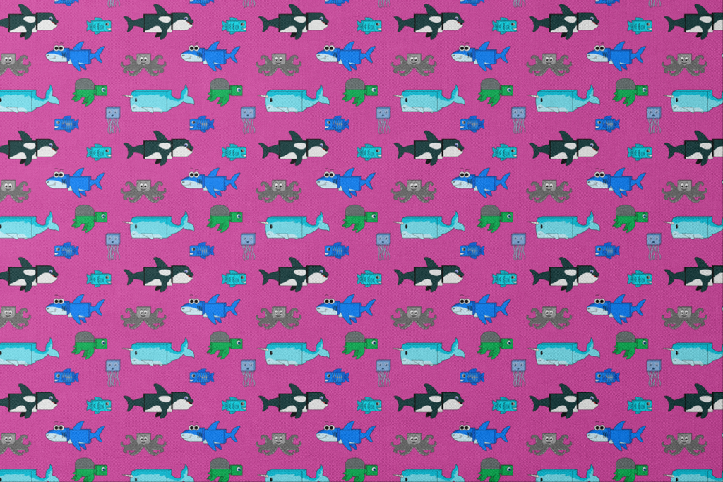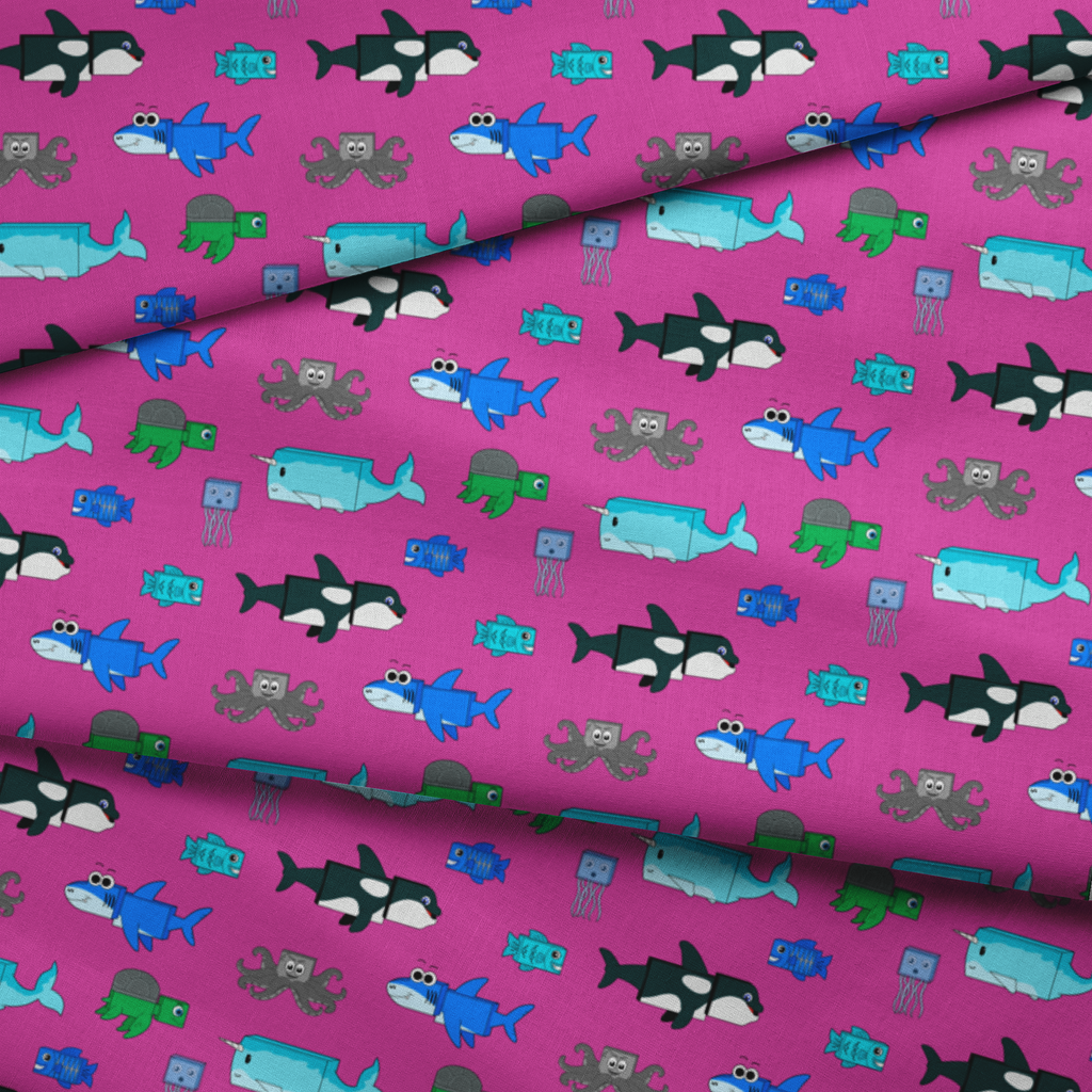 Playful English Tree cartoon sea creatures on bright purple background featuring sharks, octopi, and fish in blue, green, and black. Perfect for children's apparel or marine-themed decor.