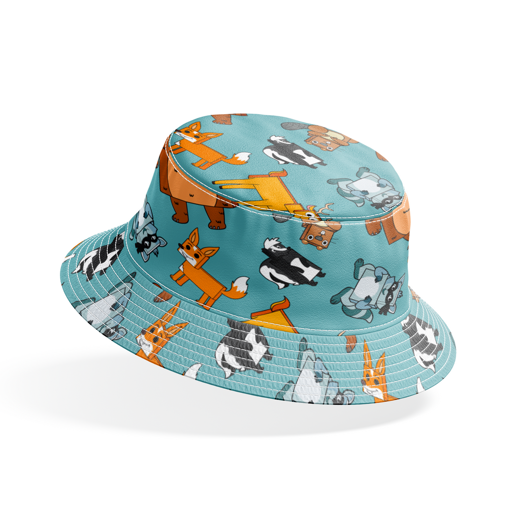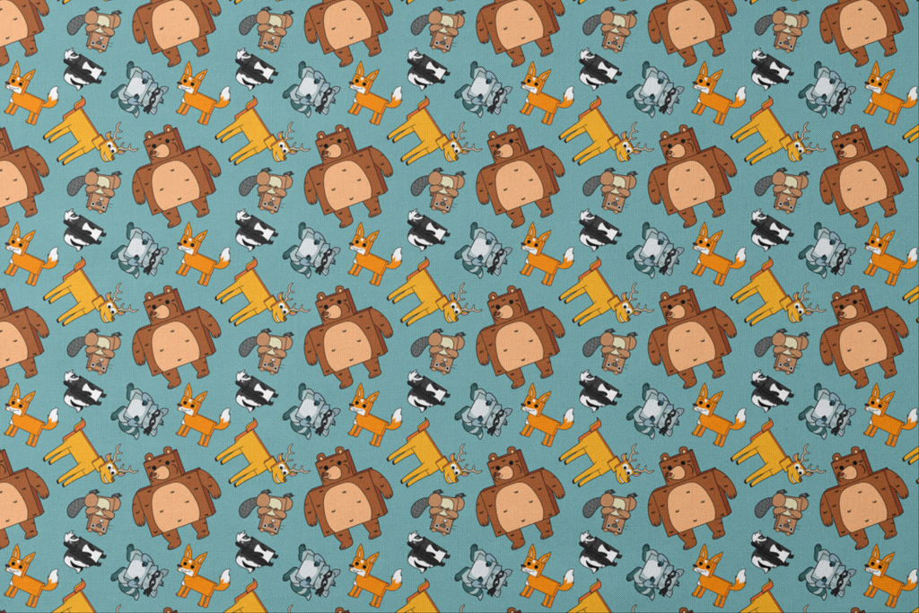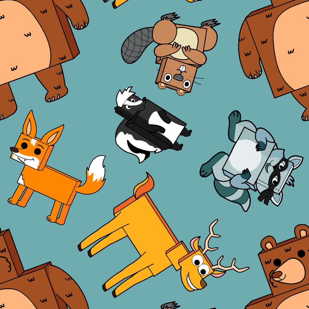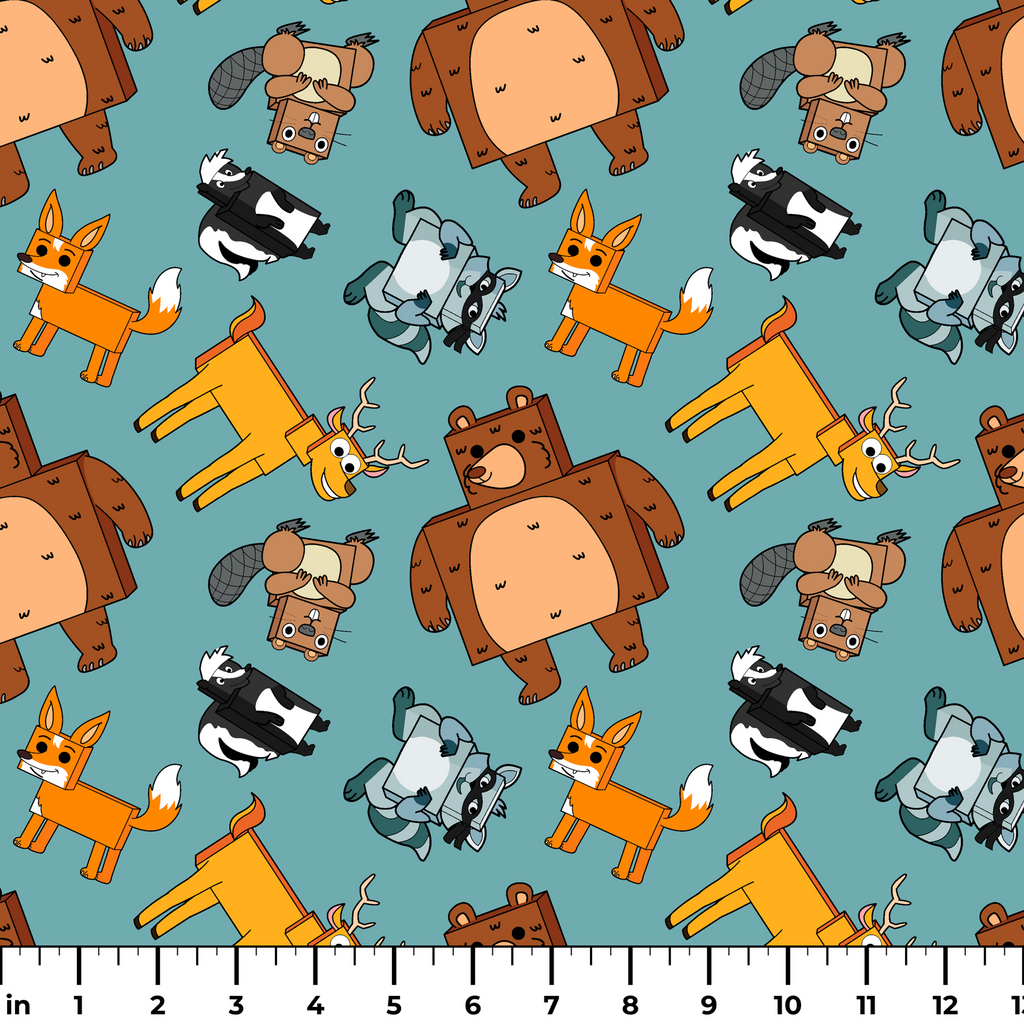 Adorable English Tree cartoon woodland creatures including foxes, beavers, bears, and deer in a playful pattern on a light blue background. Perfect for children's room decor or nursery accents.
