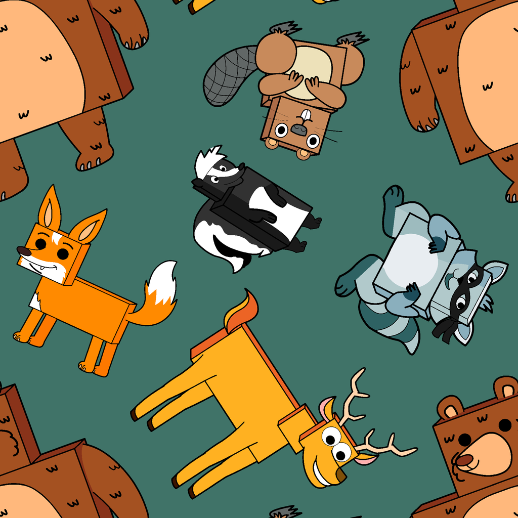 Playful English Tree woodland creatures in quirky poses, featuring foxes, bears, skunks, beavers, and deer in a modern cartoon style on a dark green background.