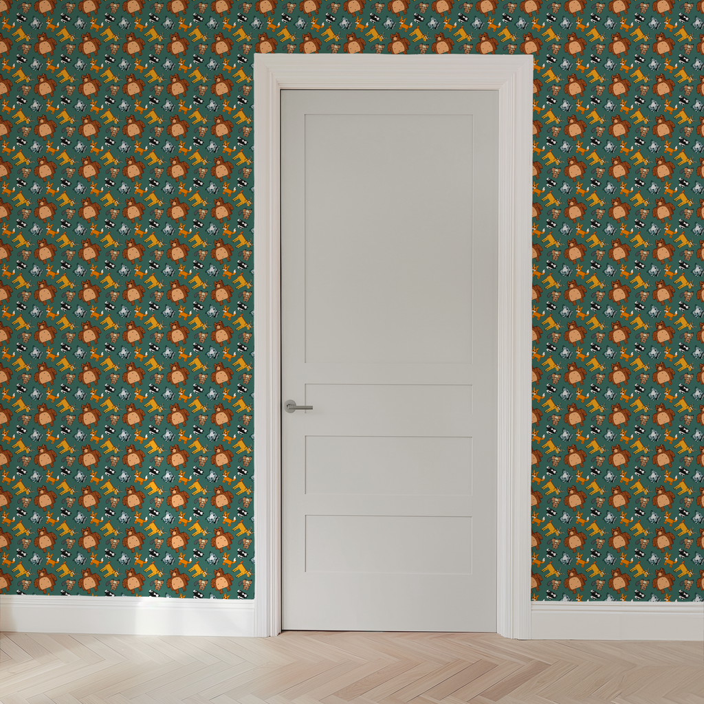 English Tree Cute Woodland Animals on Dark Green Wallpaper