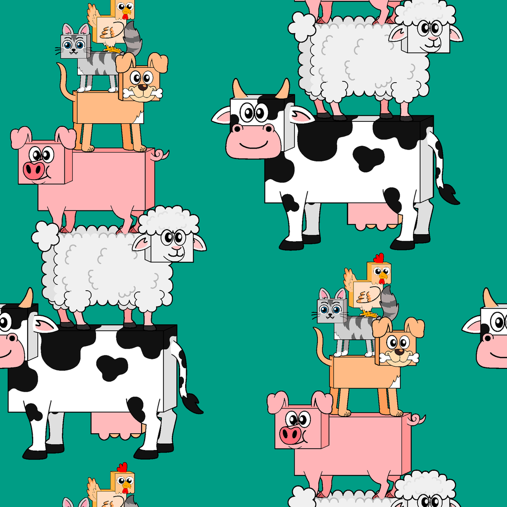 Playful English Tree stacking farm animal pattern featuring cartoon cows, sheep, and pigs on a vibrant green, teal background - perfect for kids' rooms and nurseries.