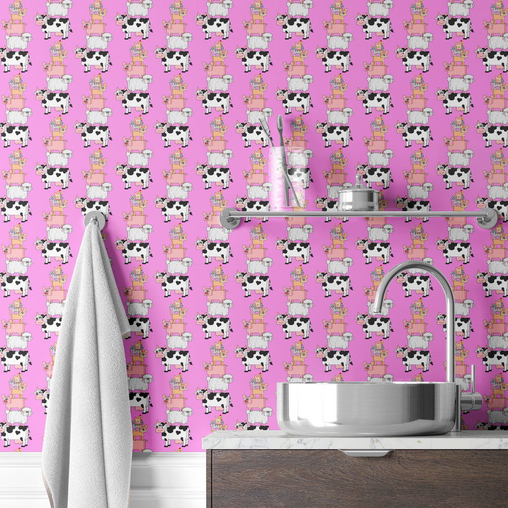 English Tree Farm Animals Stack on Pink Wallpaper