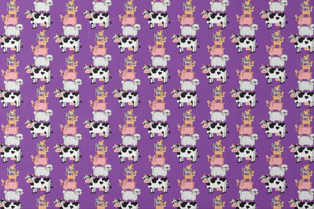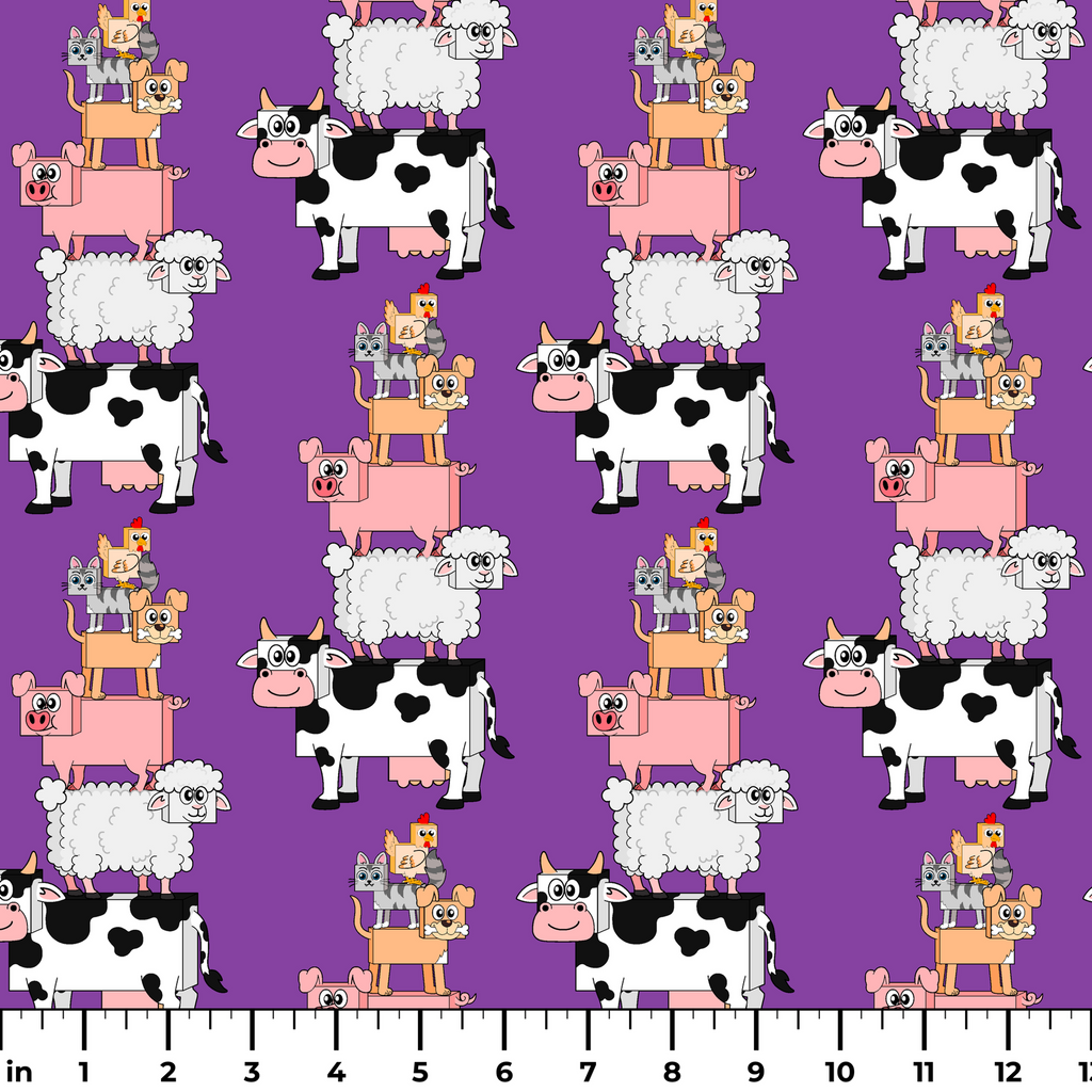 Playful English Tree farm animals pattern featuring cartoon cows, sheep, and pigs stacked in fun formations on a vibrant purple background - perfect for children's apparel or nursery decor.