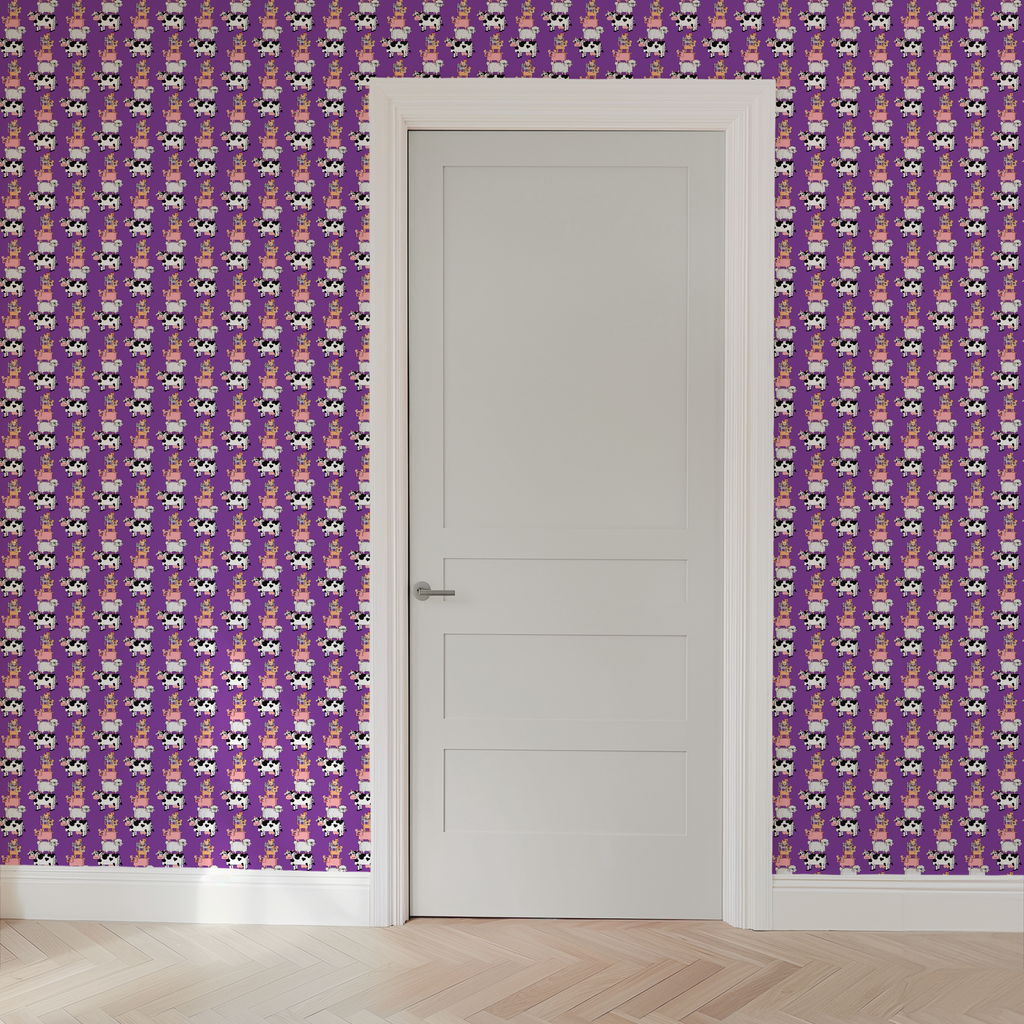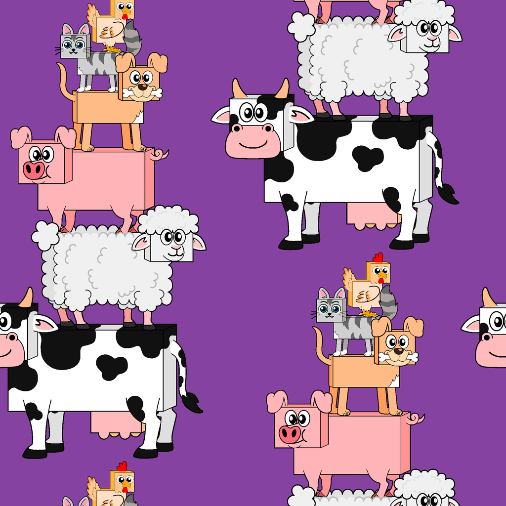 Playful English Tree farm animals pattern featuring cartoon cows, sheep, and pigs stacked in fun formations on a vibrant purple background - perfect for nurseries and kids' rooms.