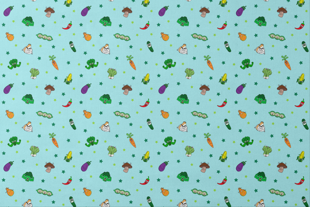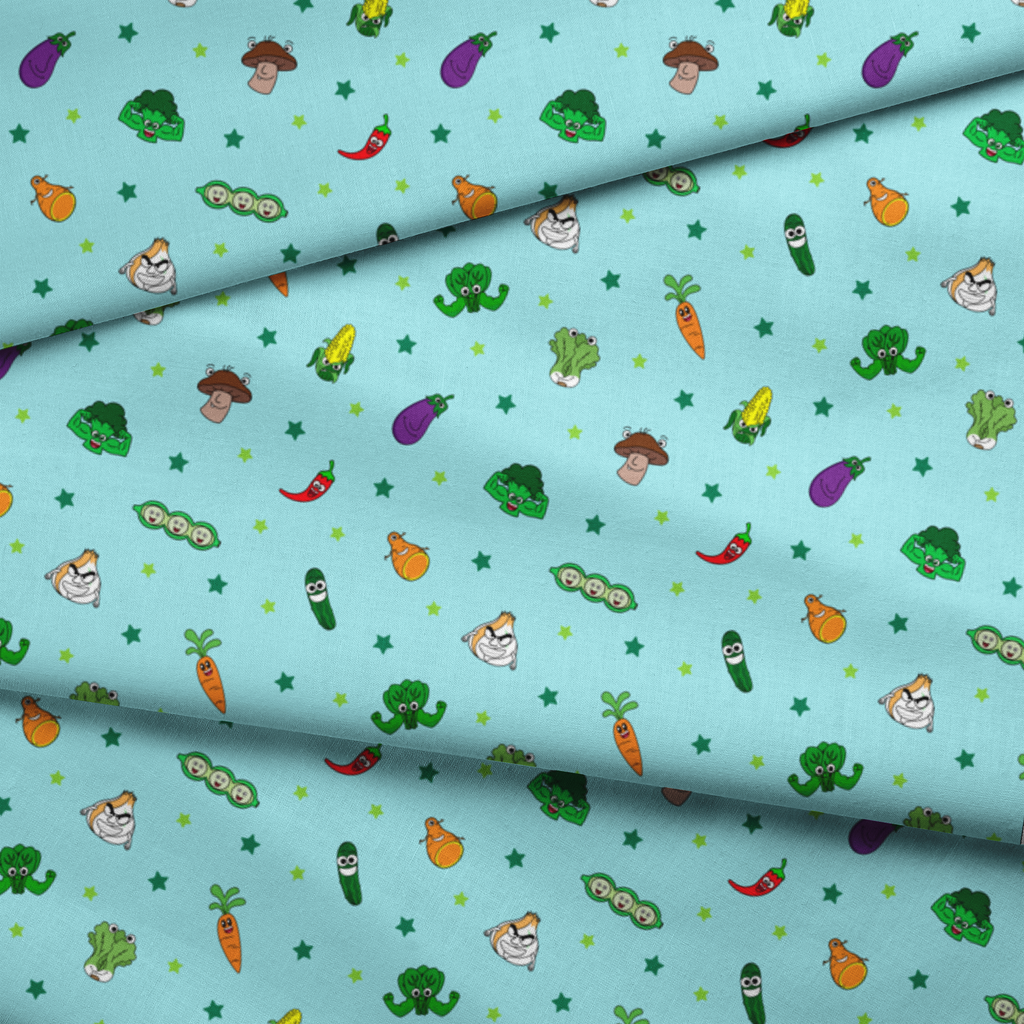 English Tree Happy Veggie Characters on Blue Fabric
