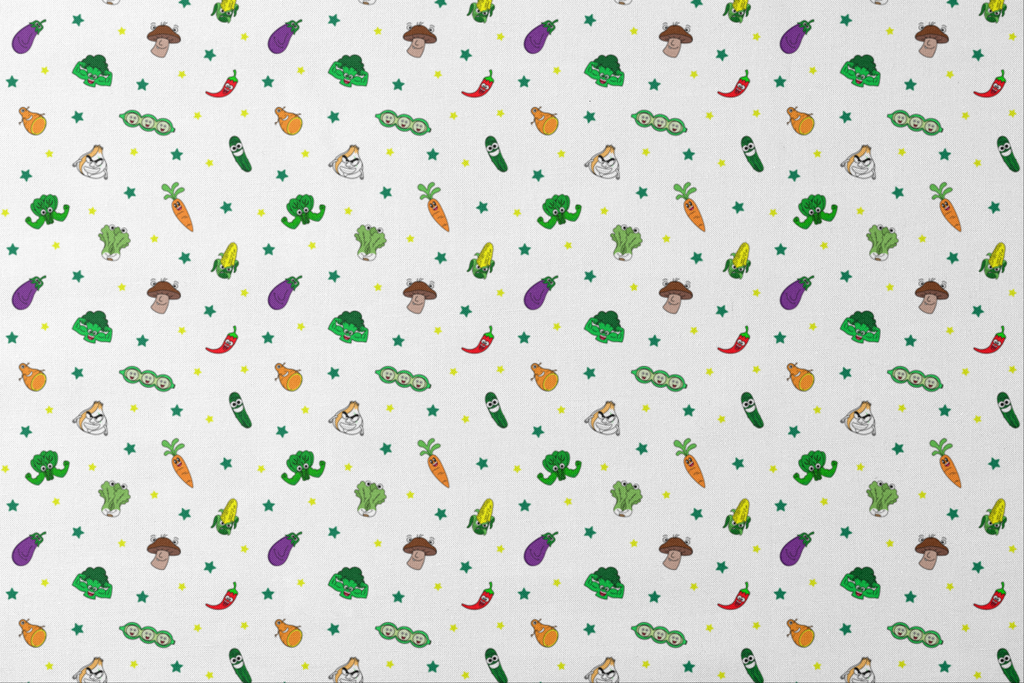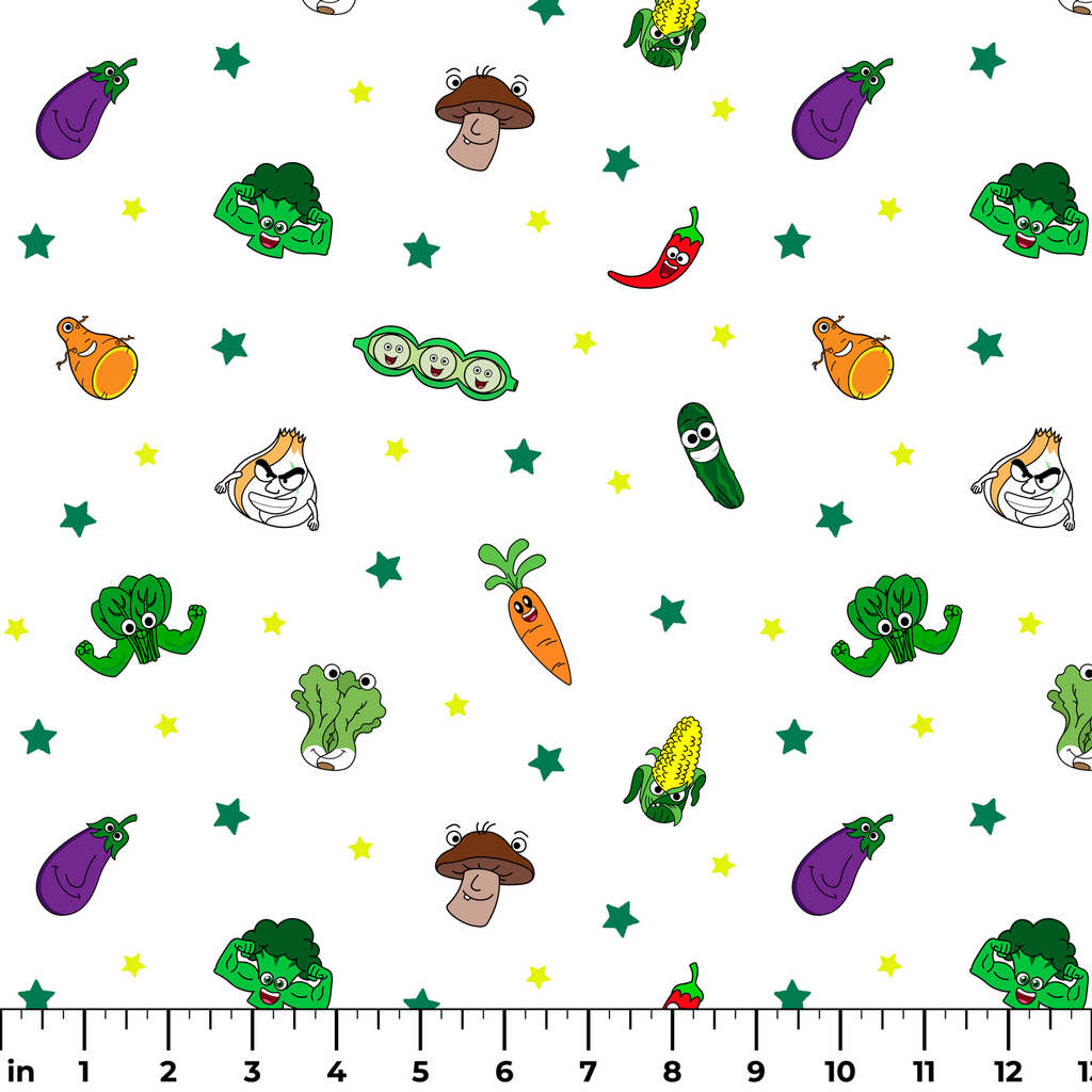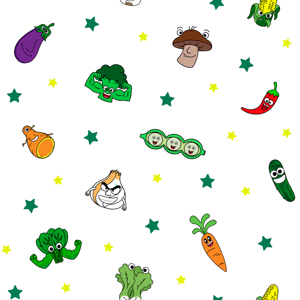 Cute English Tree cartoon vegetables with happy faces scattered on a white background with green and yellow stars, perfect for fun kitchen or nursery decor.