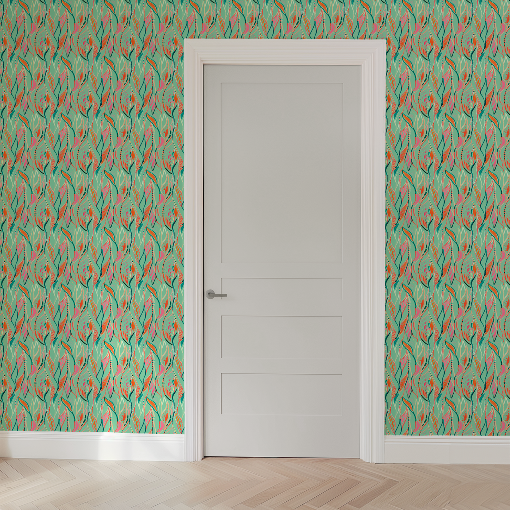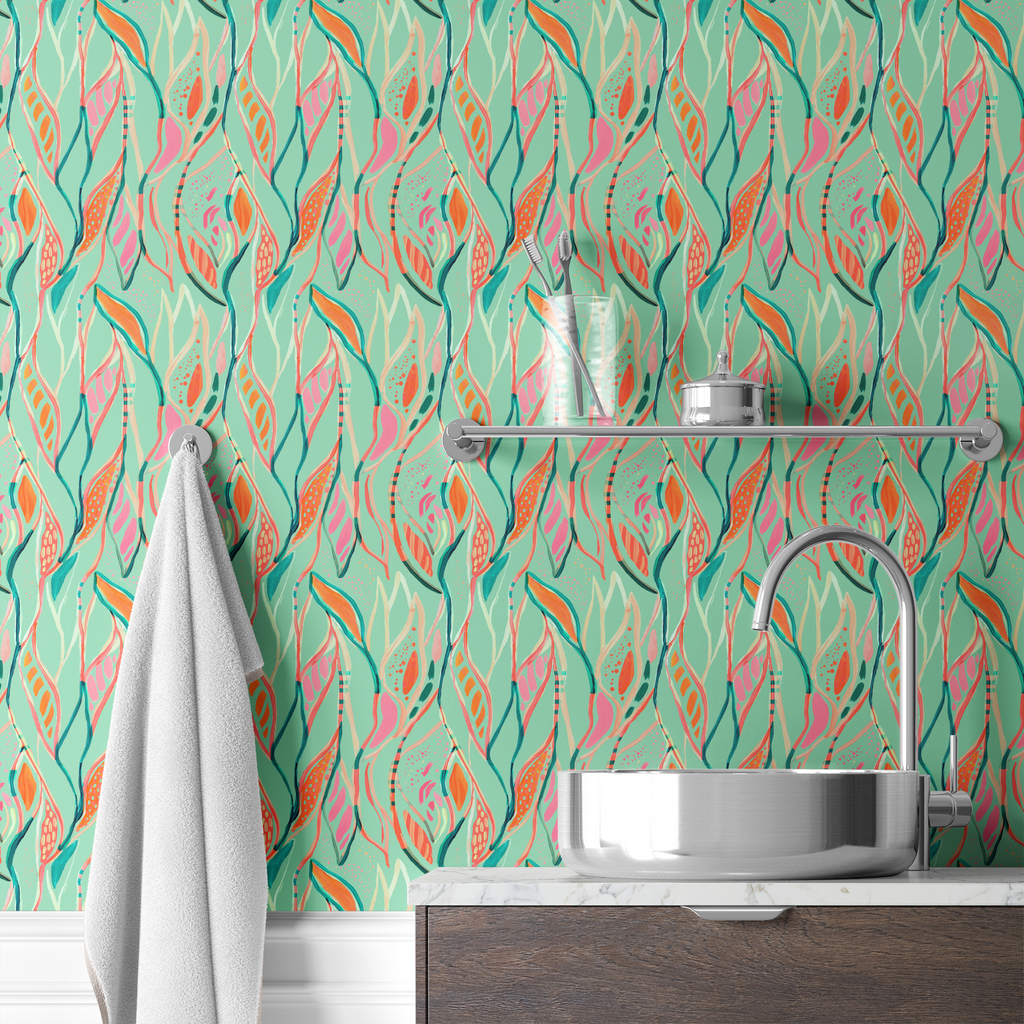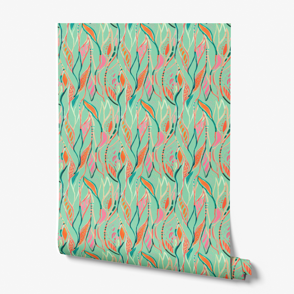 This vibrant botanical pattern features flowing abstract shapes in coral, pink, and emerald green against a mint background, creating a fresh, tropical feel perfect for modern spaces.