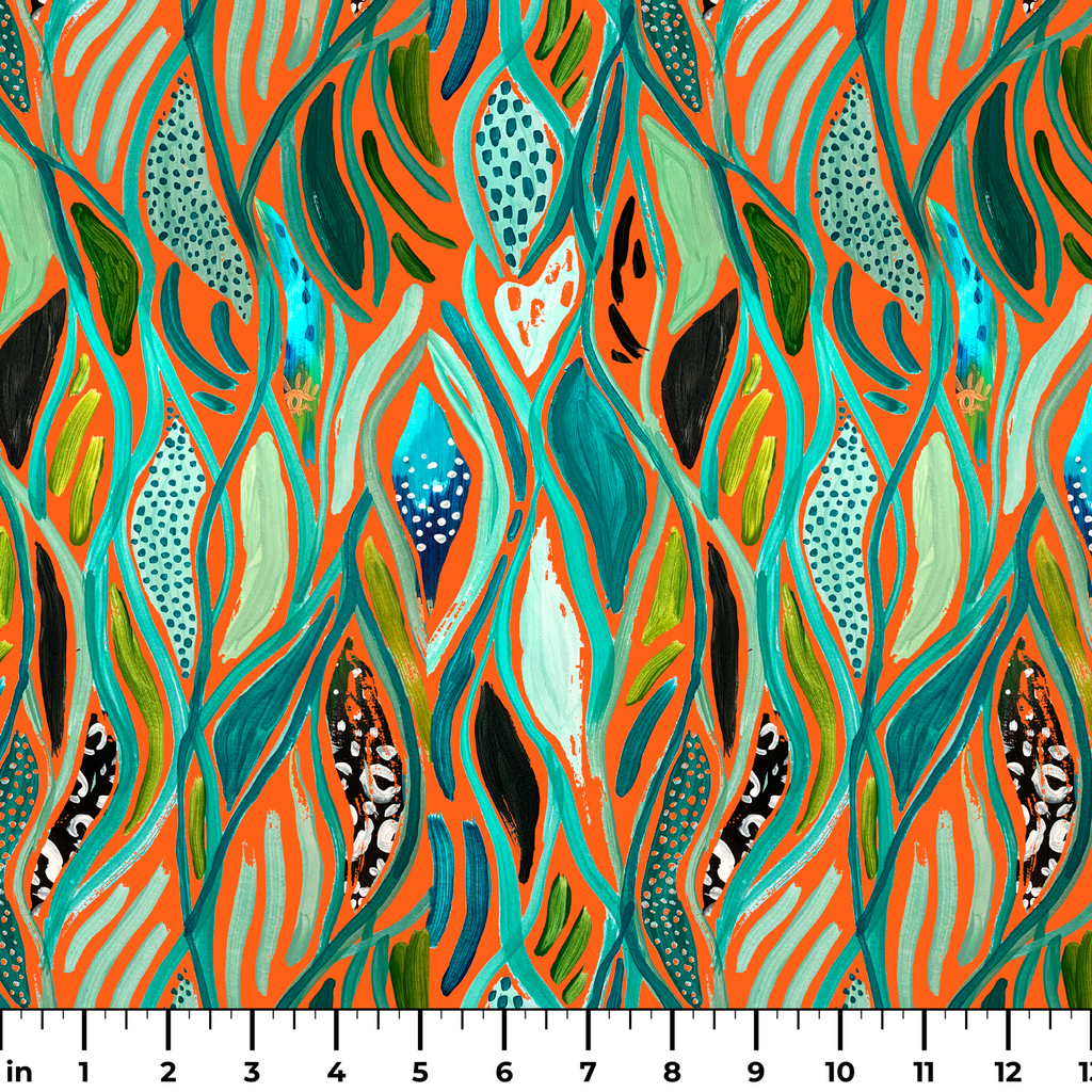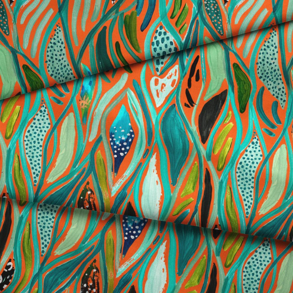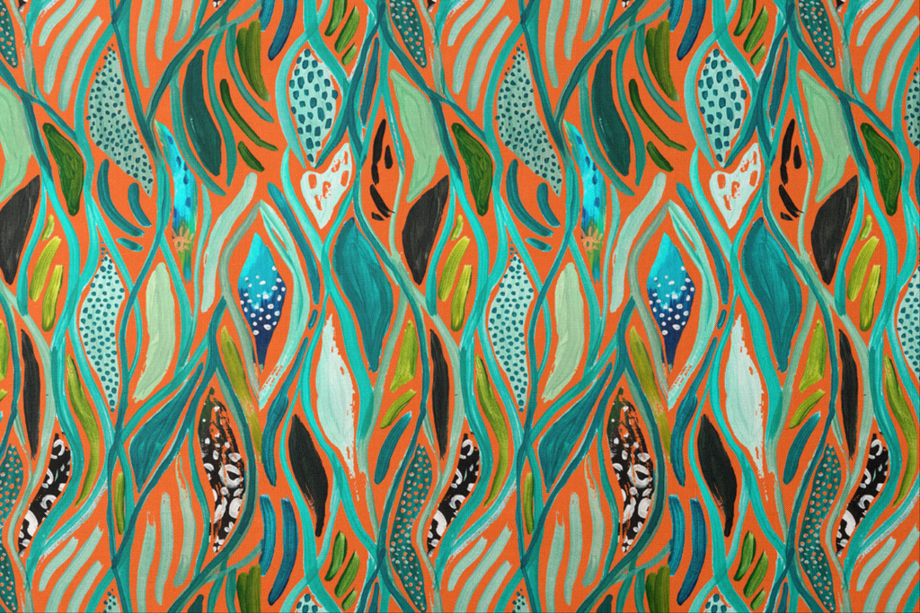This vibrant abstract pattern features organic flowing shapes in teal, orange, and gold with textured dotted elements, creating a dynamic tropical-inspired design perfect for modern home decor.