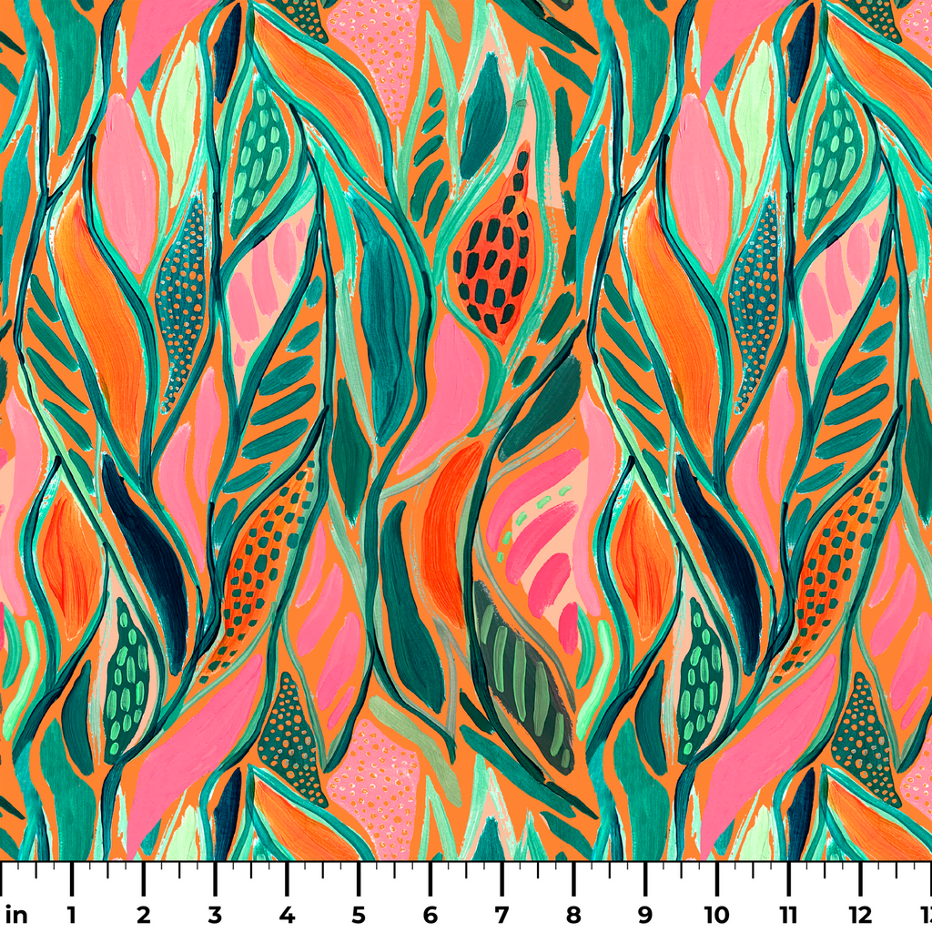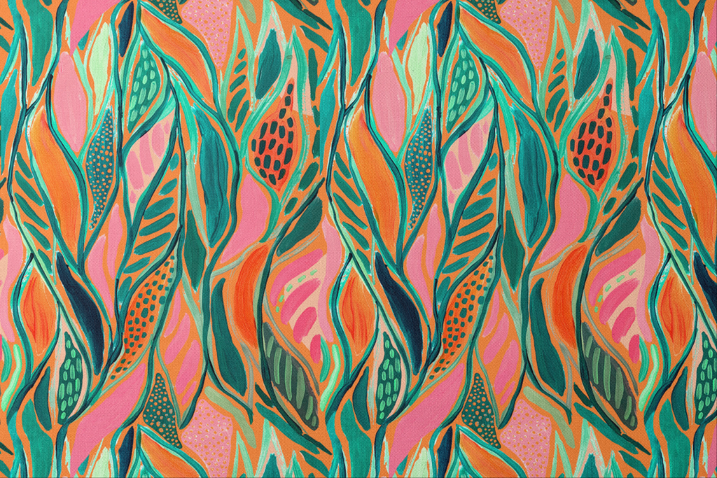 Vibrant tropical pattern featuring swirling leaves in bold coral, teal, and orange with abstract spotted accents, perfect for a modern bohemian aesthetic.