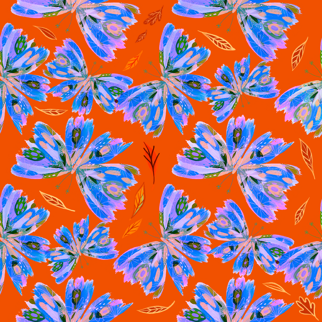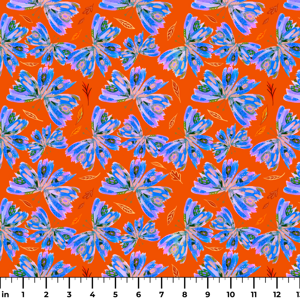 Vibrant purple butterflies dance across a rich orange background surrounded by fall leaves, perfect for adding a touch of nature-inspired charm to your space.