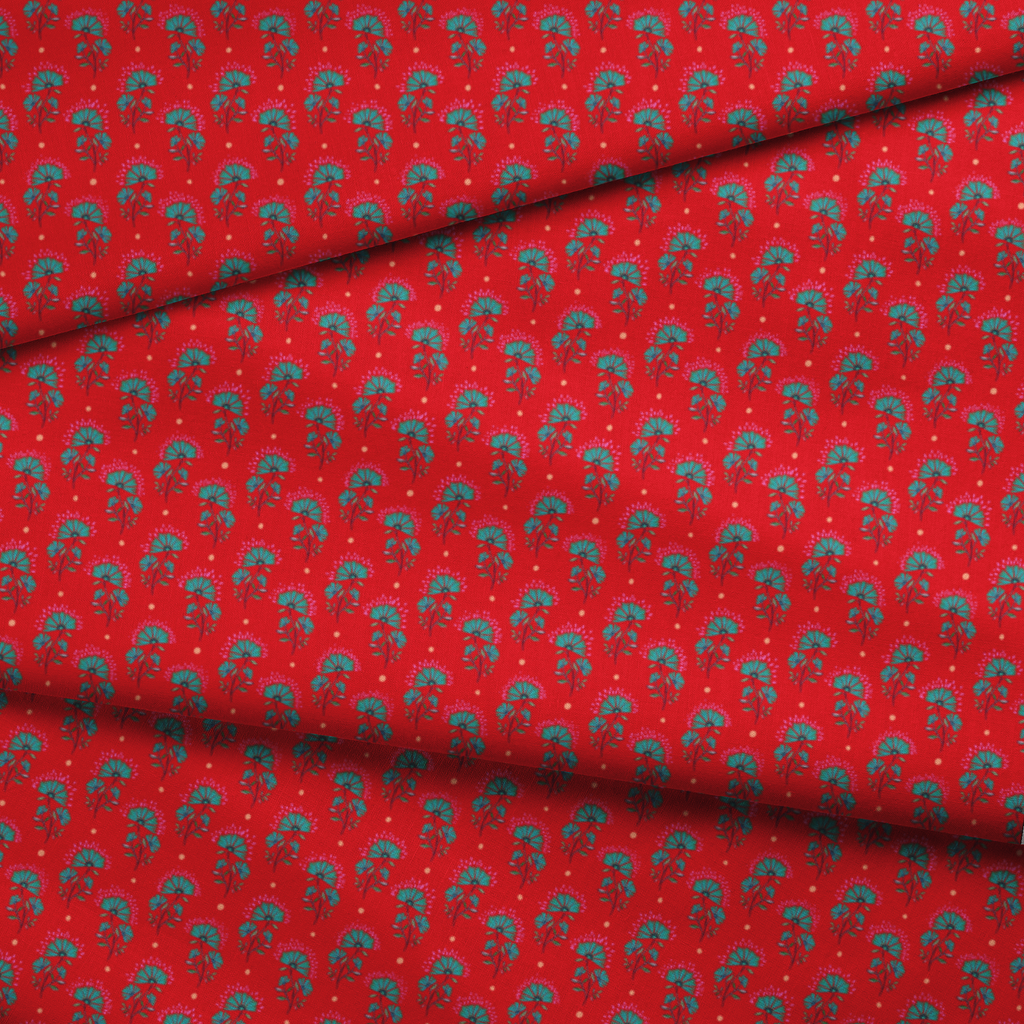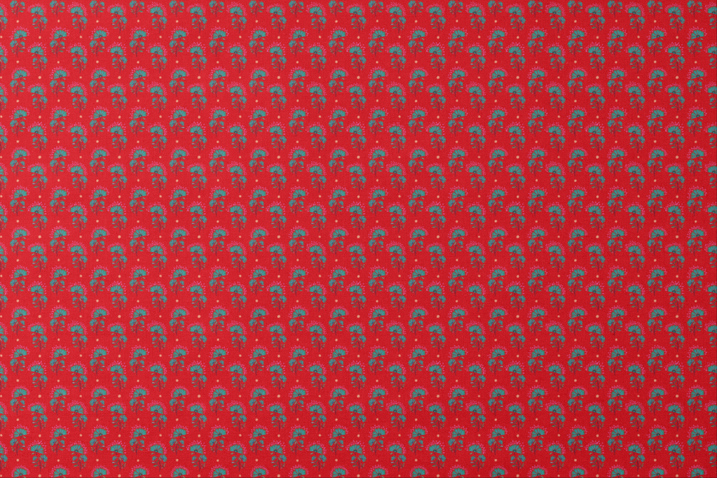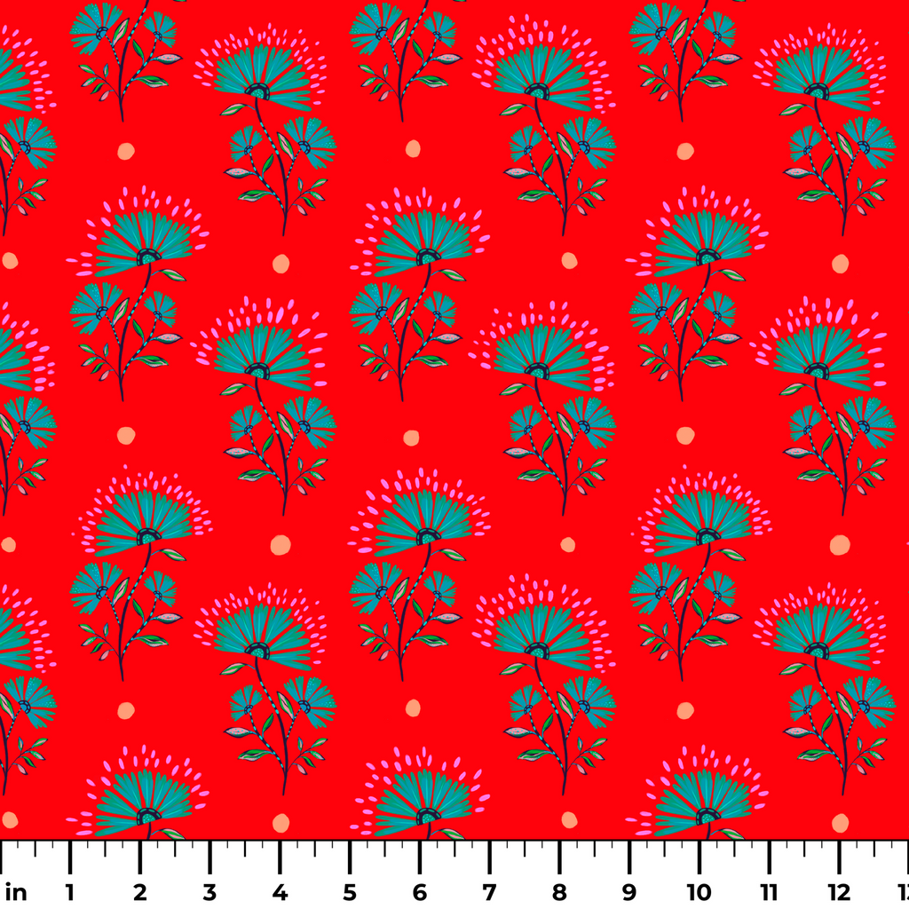 Bold turquoise floral pattern on vibrant red background featuring stylized fan-like blooms in a contemporary botanical design.