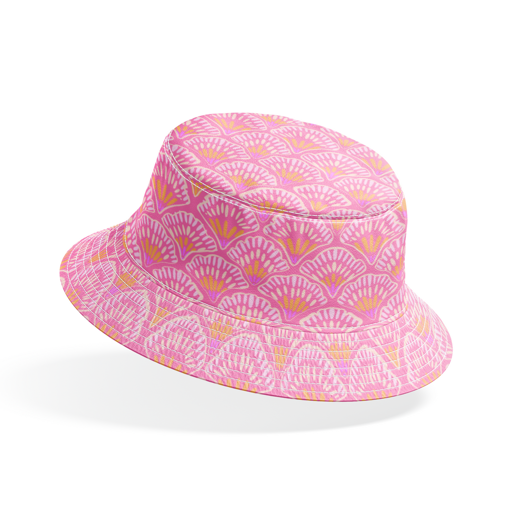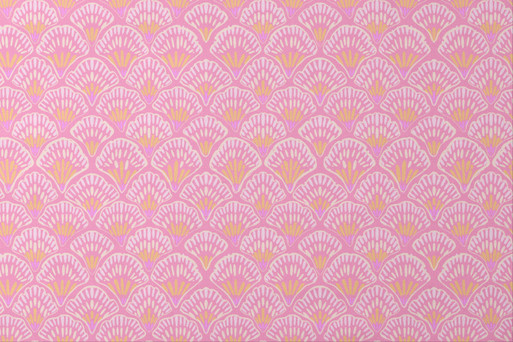 This elegant pink and orange fan pattern brings Art Deco vibes to any space with its geometric scalloped design in a cheerful retro colorway.