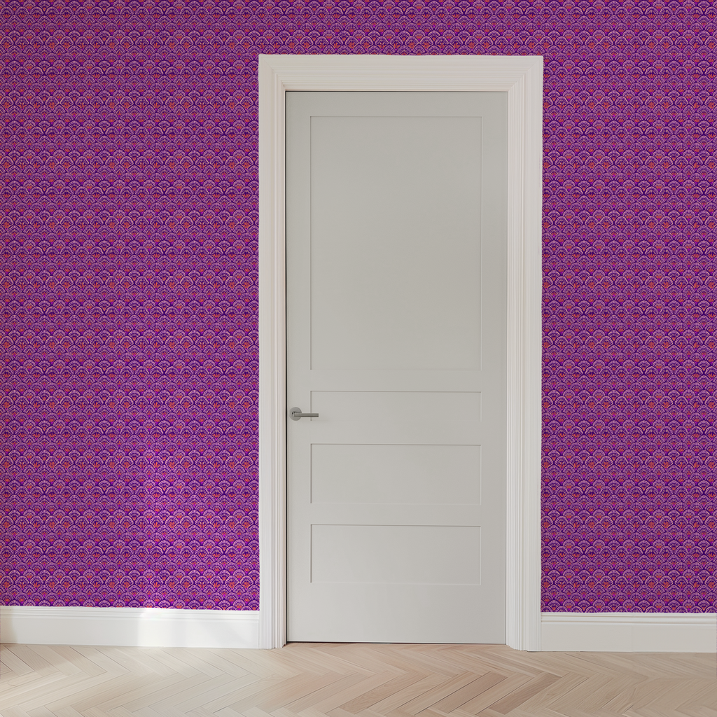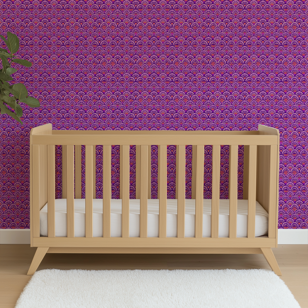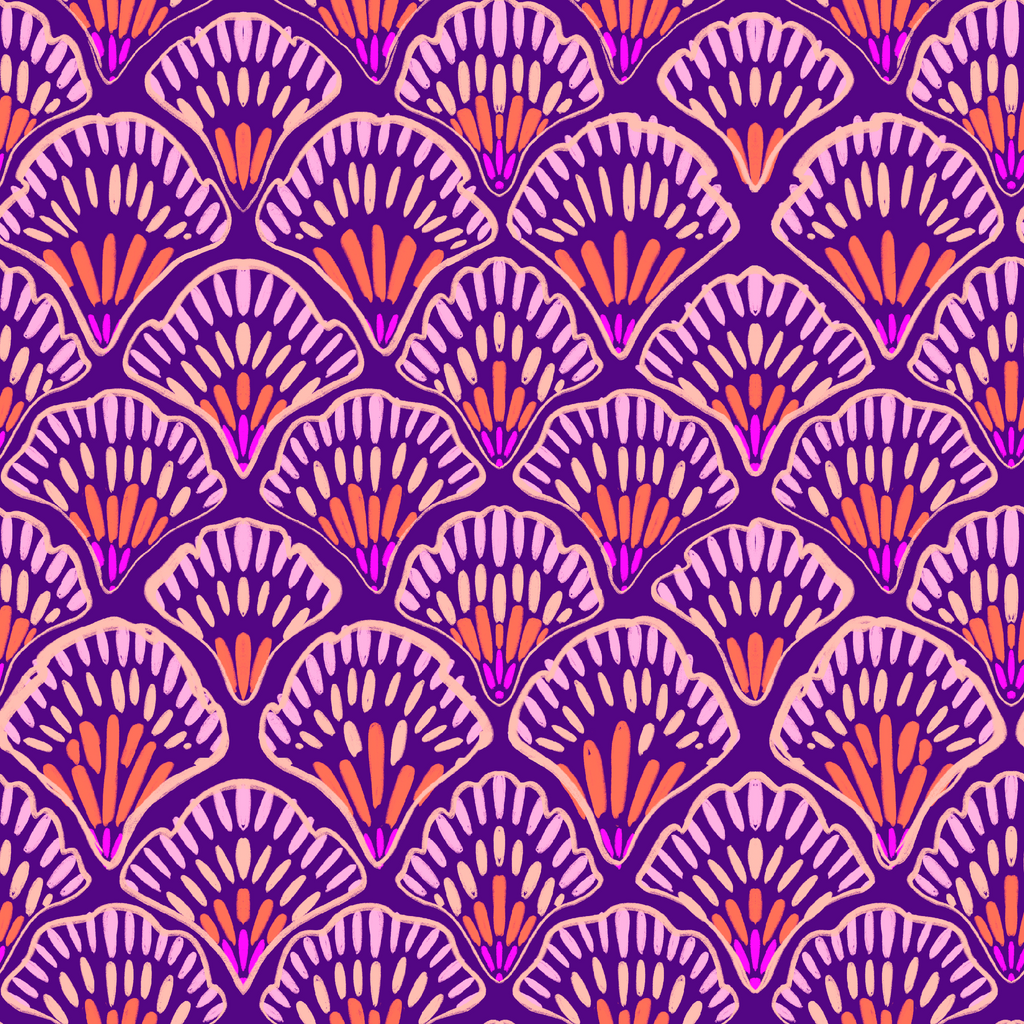 Vibrant art deco pattern featuring purple shell shapes with coral accents. This geometric design brings beach vibes to any space with its bold colors and symmetrical arrangement.