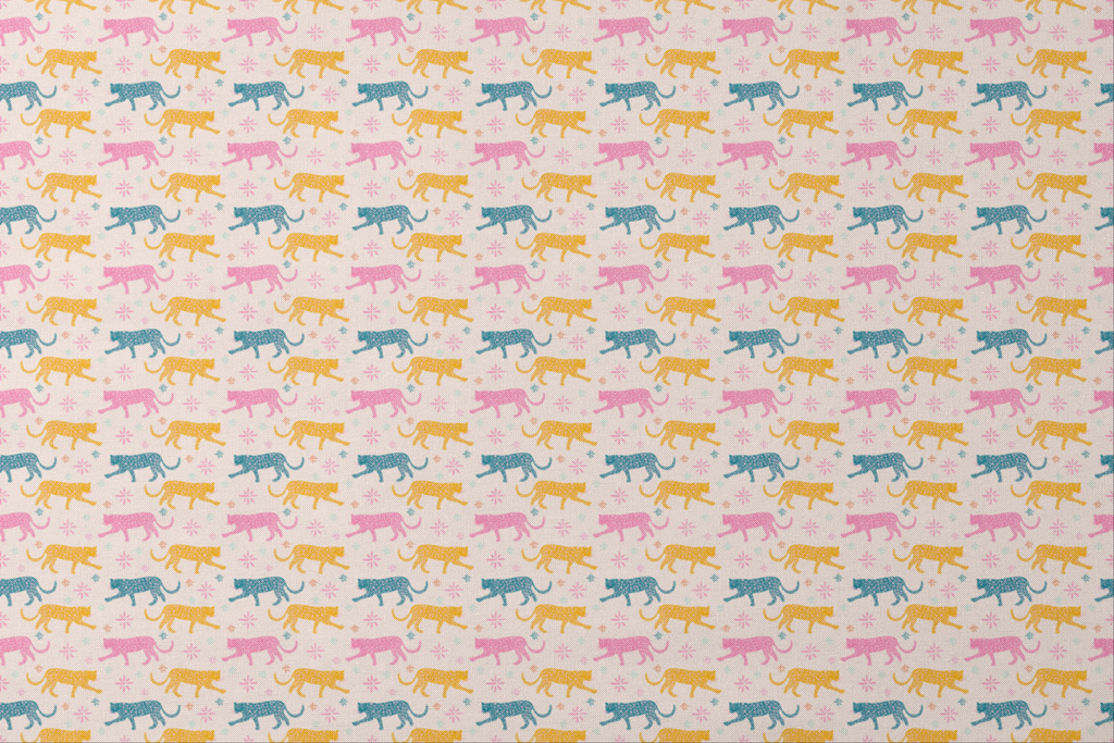 Playful leopard pattern featuring pink, yellow, and teal spotted cats on a light pink background with colorful starbursts for a whimsical, safari-inspired design.