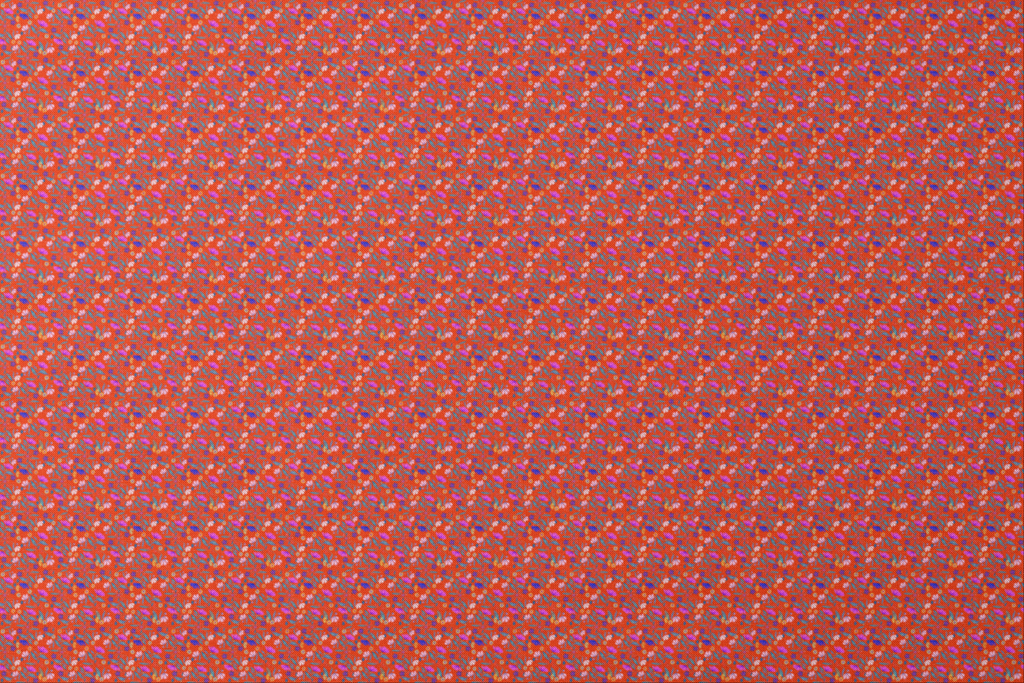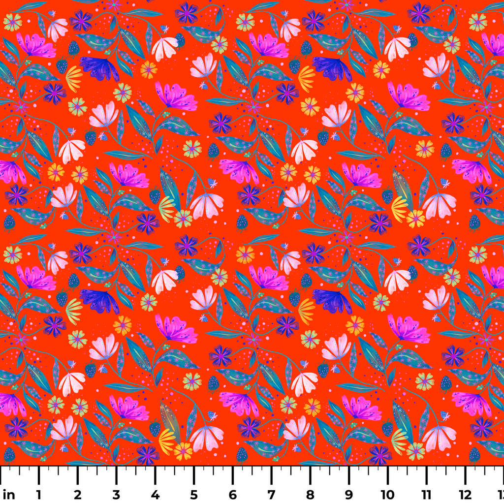 Vibrant red floral pattern with pink and purple blooms in a retro style, Perfect for bohemian home decor or contemporary apparel projects.