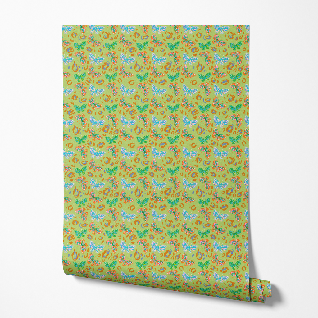 Vibrant watercolor butterflies dance across a green background, complemented by abstract leopard print spots in warm blue and brown tones, creating a playful bohemian pattern.