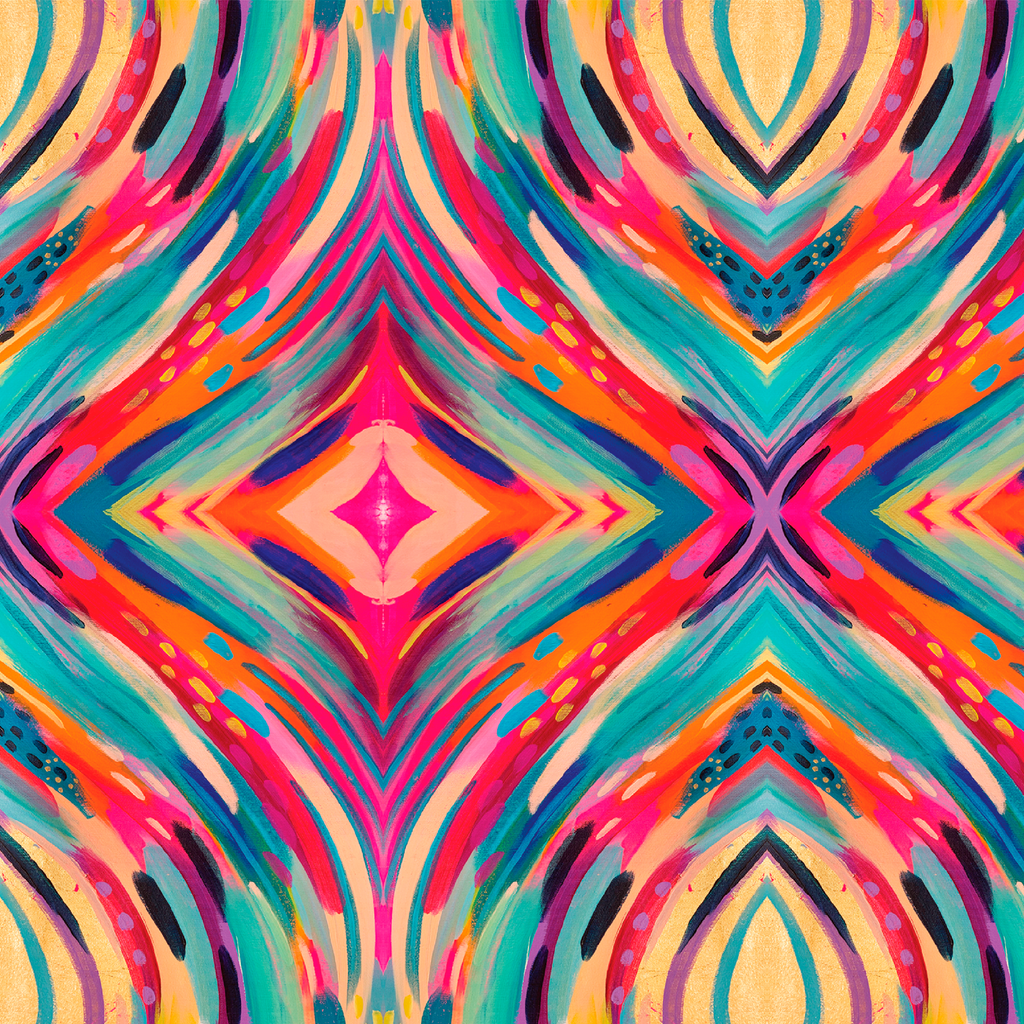 Vibrant kaleidoscope pattern featuring bold geometric shapes with swirling turquoise, pink, red, and orange brushstrokes creating a mesmerizing diamond-shaped focal point. Perfect for adding a vivid touch to any space.