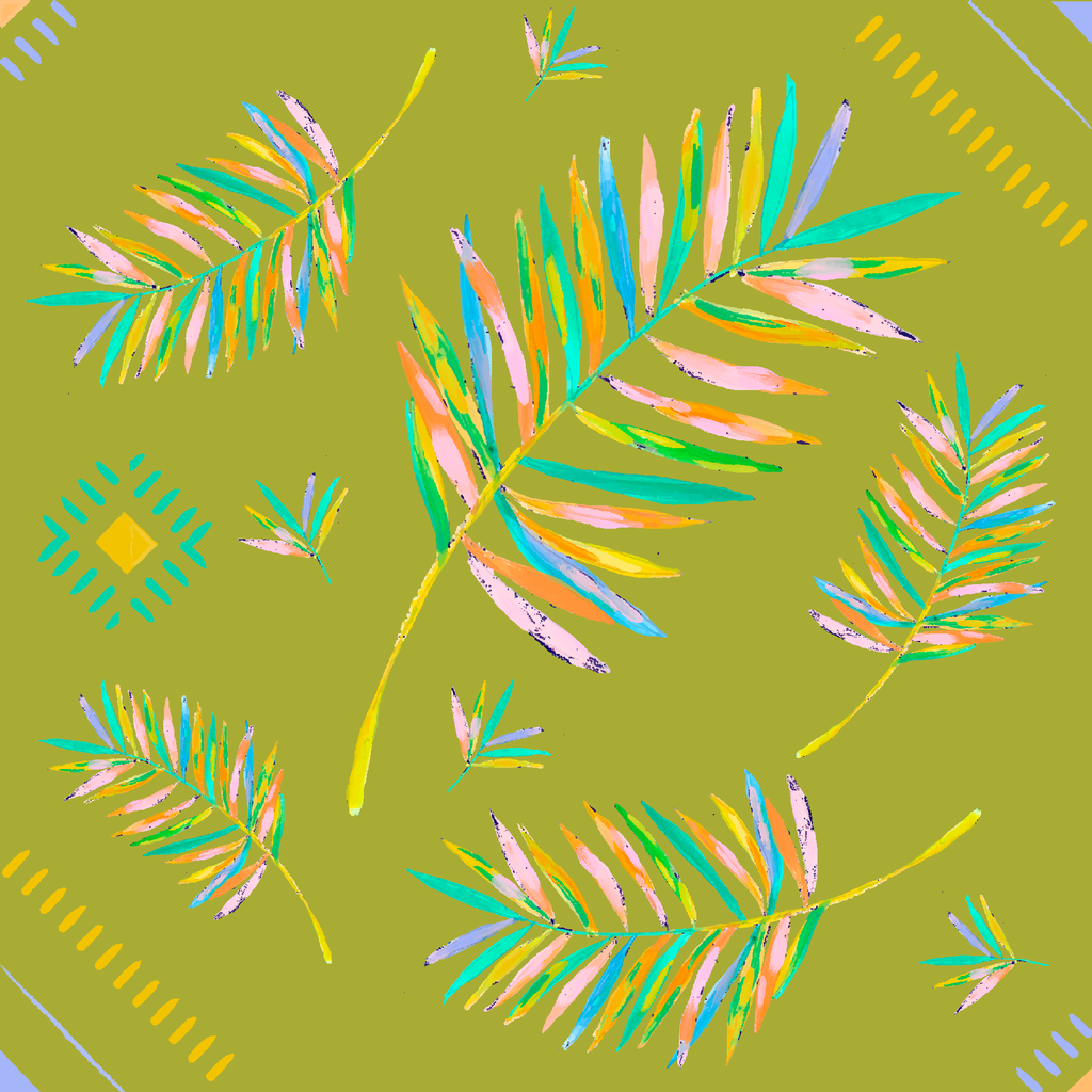 Vibrant tropical palm fronds in teal, coral, and yellow dance across a mustard background, creating a bold botanical pattern perfect for summer-inspired spaces.