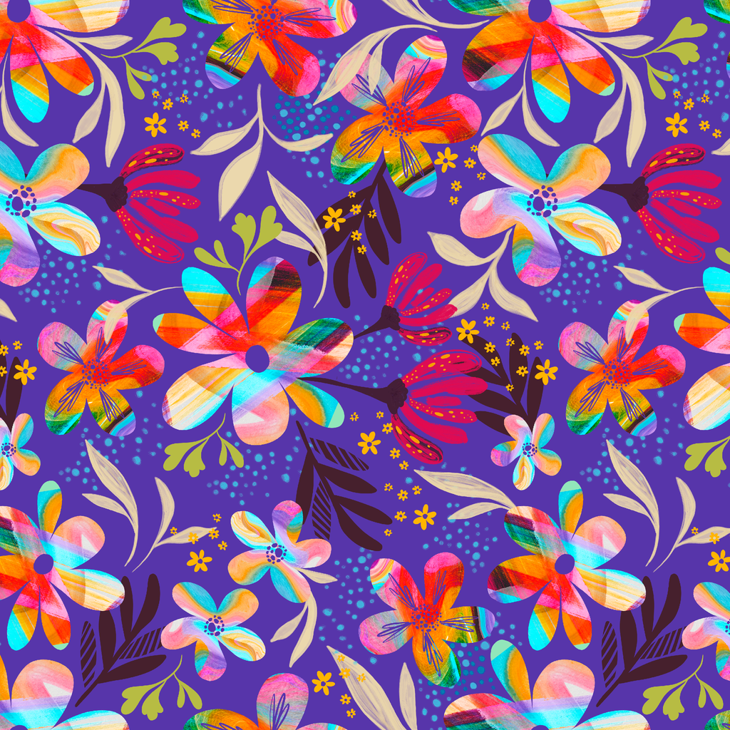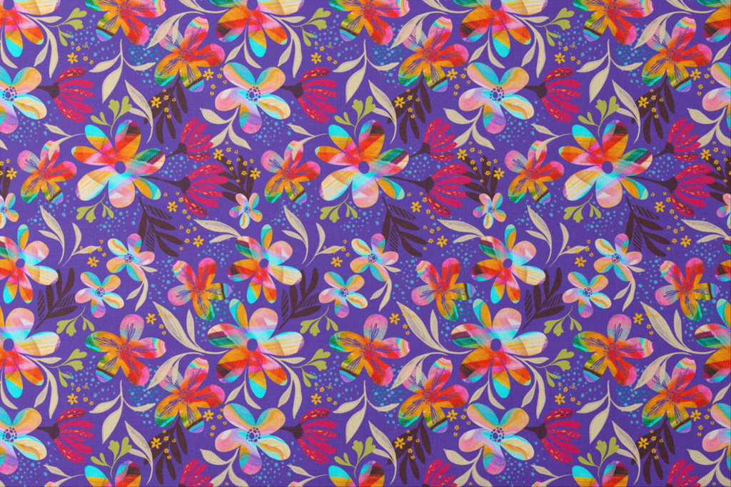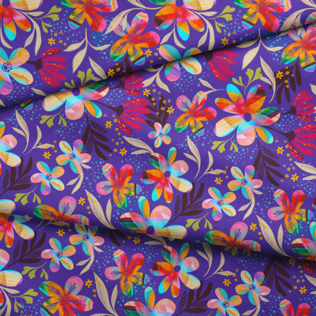 This vibrant floral pattern features colorful blooms in bright rainbow hues against a rich purple background, creating a cheerful and bohemian summer design.