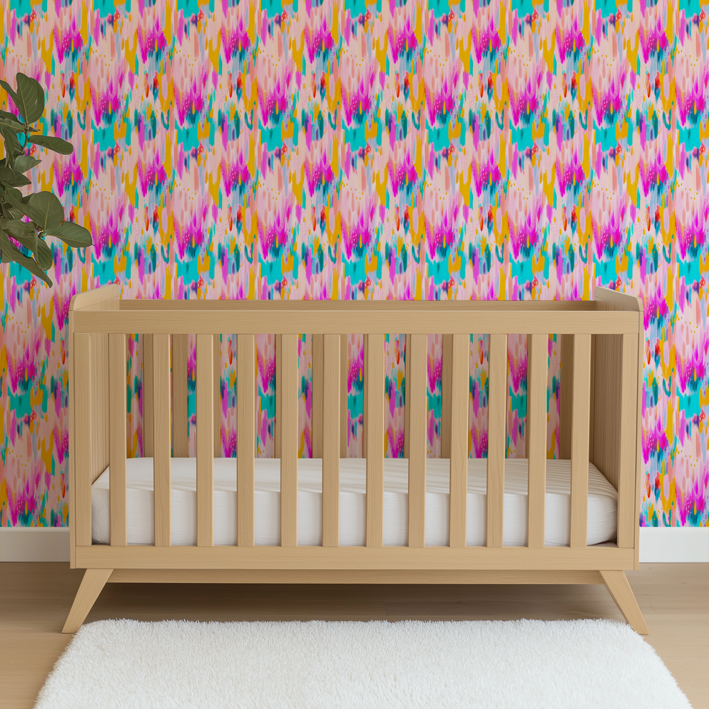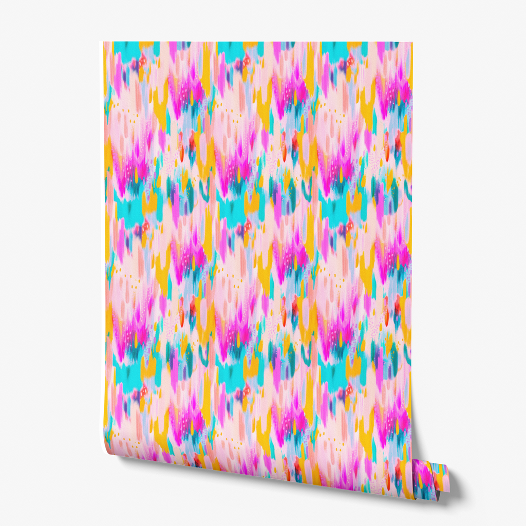 Vibrant abstract art with bold brushstrokes in pink, yellow, turquoise and orange creates a playful summer aesthetic perfect for trendy vibes for any space.