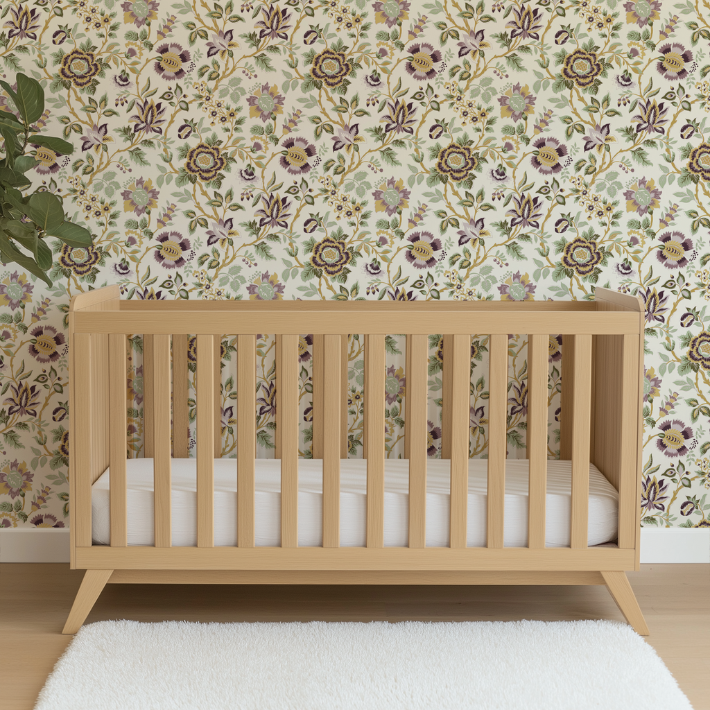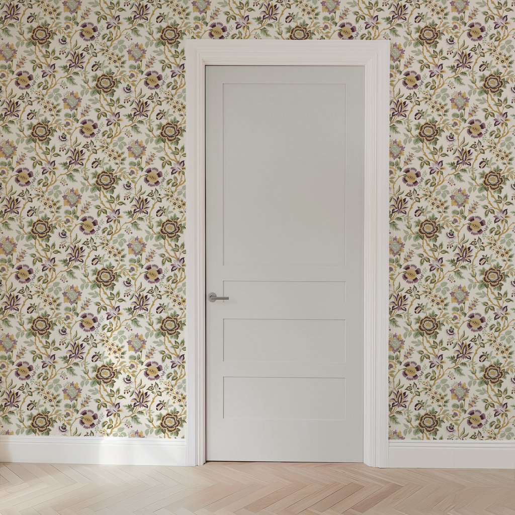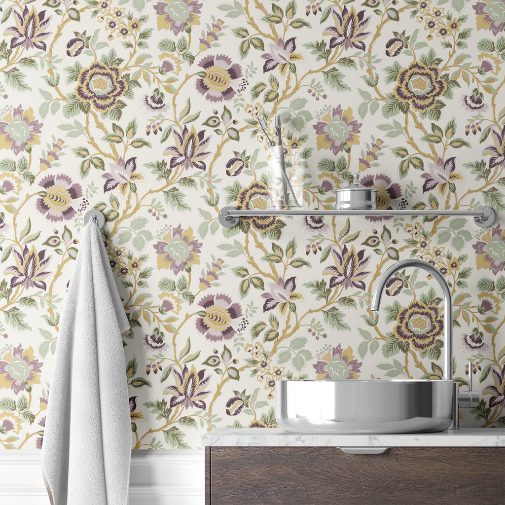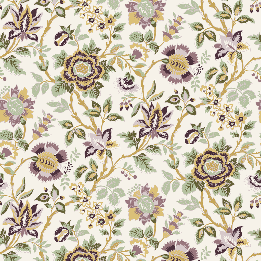 Elegant botanical chintz featuring intricate floral motifs in soft purple, yellow and green hues on a cream background. Perfect for a vintage-inspired, eclectic farmhouse style.