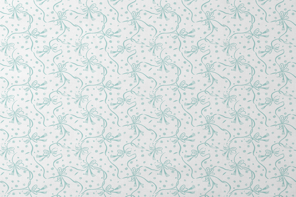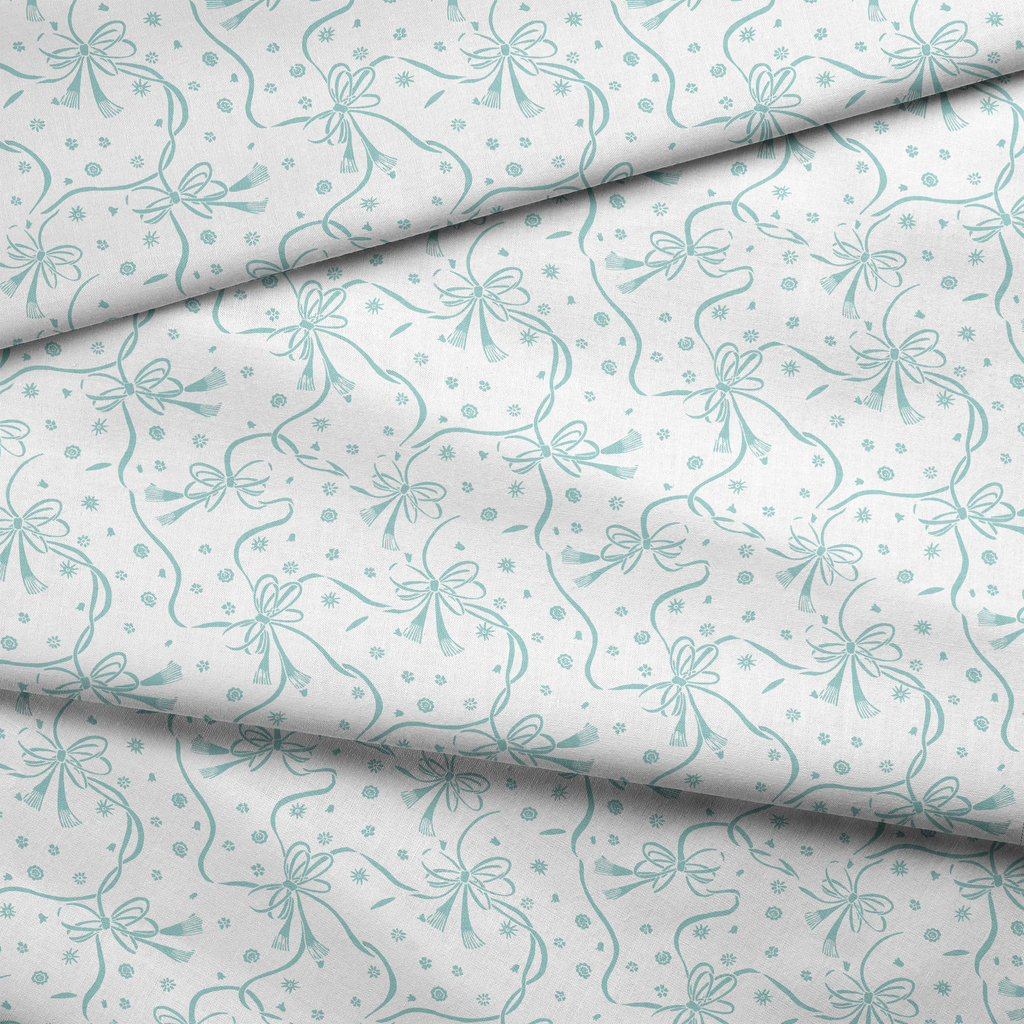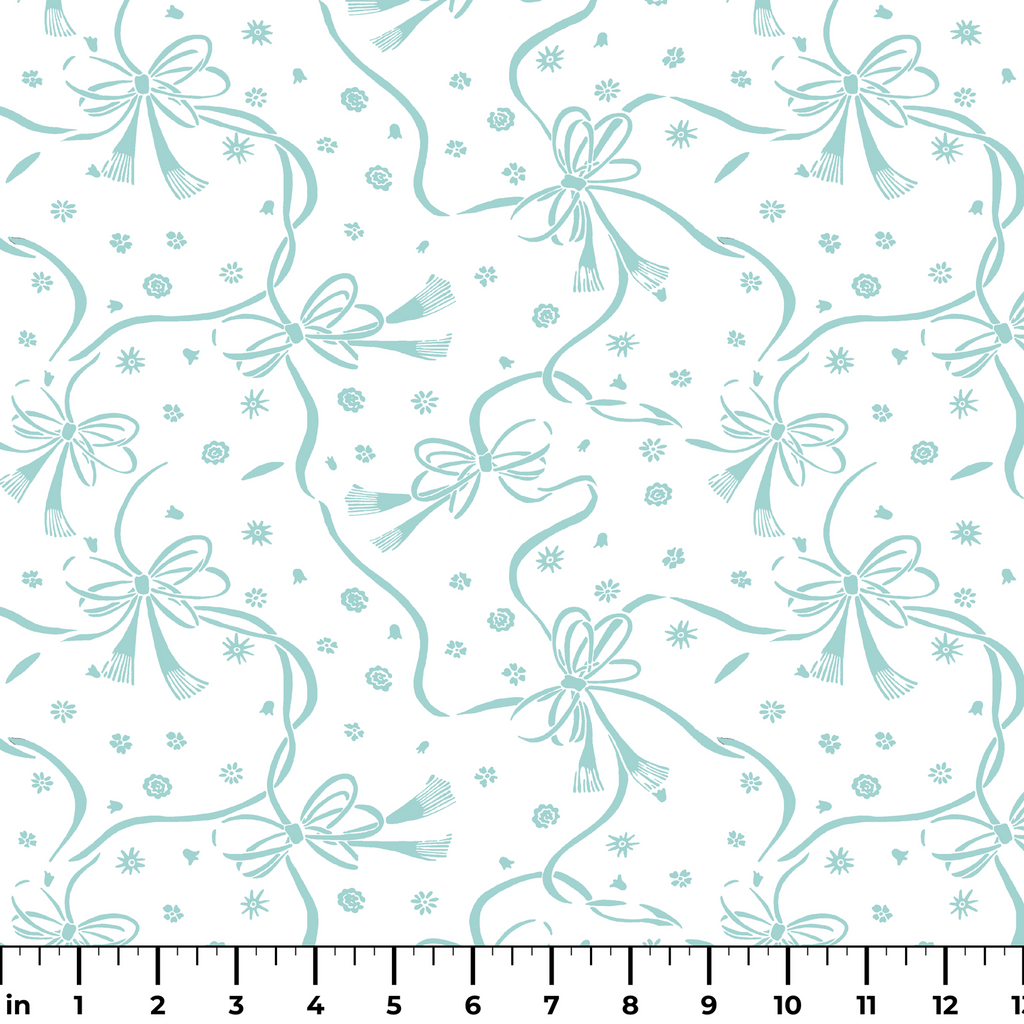 Delicate teal bows and flourishes dance across this whimsical pattern, creating a romantic inspired design perfect for sweet apparel, craft projects, or nursery decor.