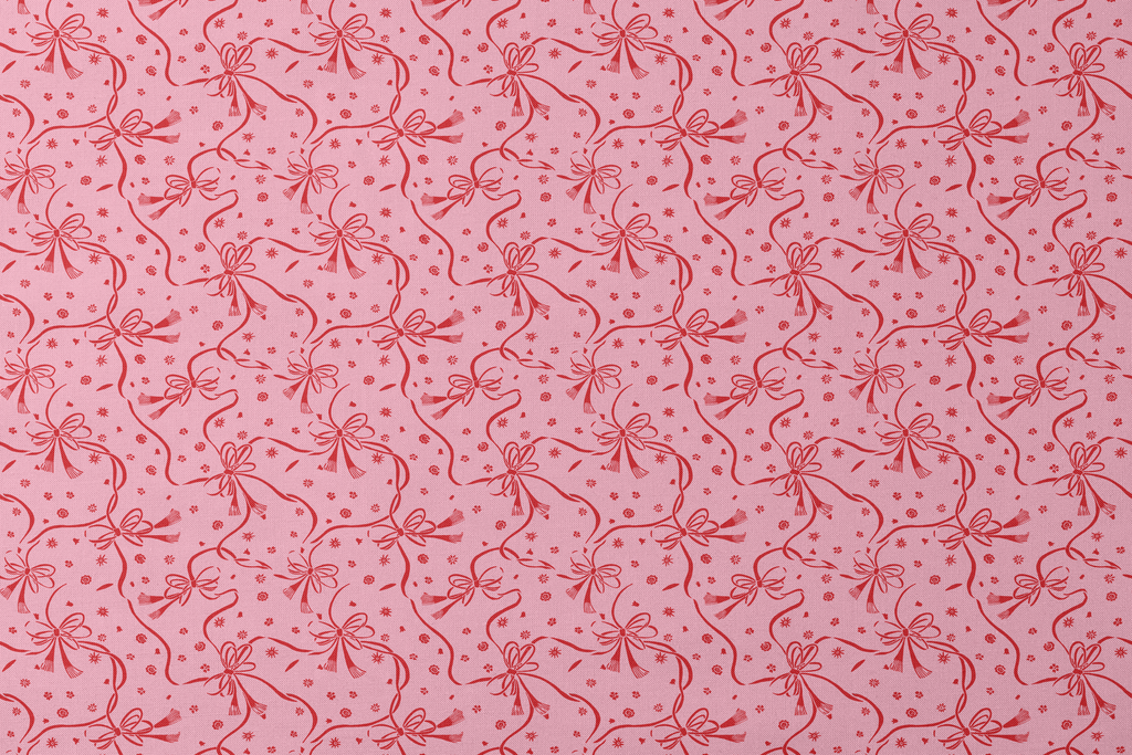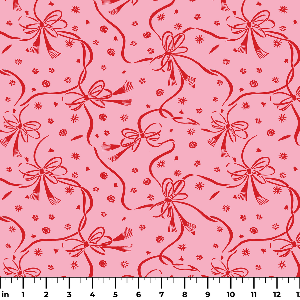 Delicate pink and red bows and flourishes dance across this whimsical pattern, creating a romantic inspired design perfect for sweet apparel, craft projects, or nursery decor.