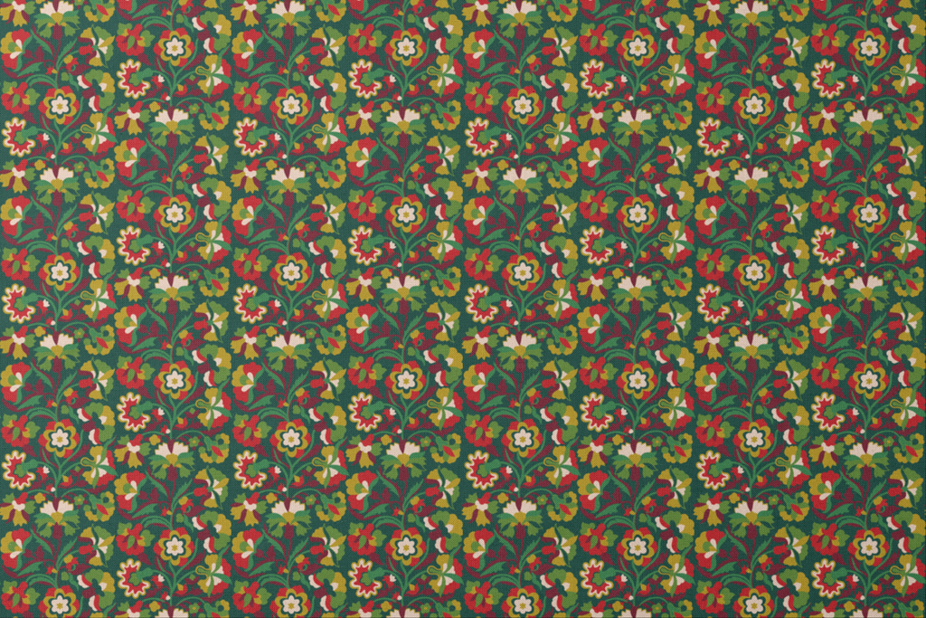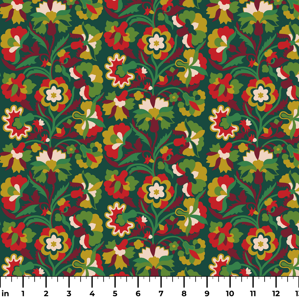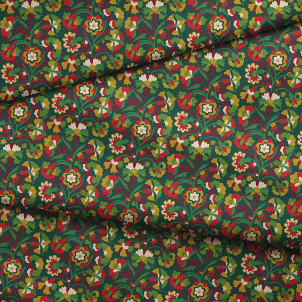 Festive floral pattern with intricate blooms in rich green, gold, and red, showcasing a traditional winter heritage design with flowing vines and stylized flowers perfect for holiday home decor.