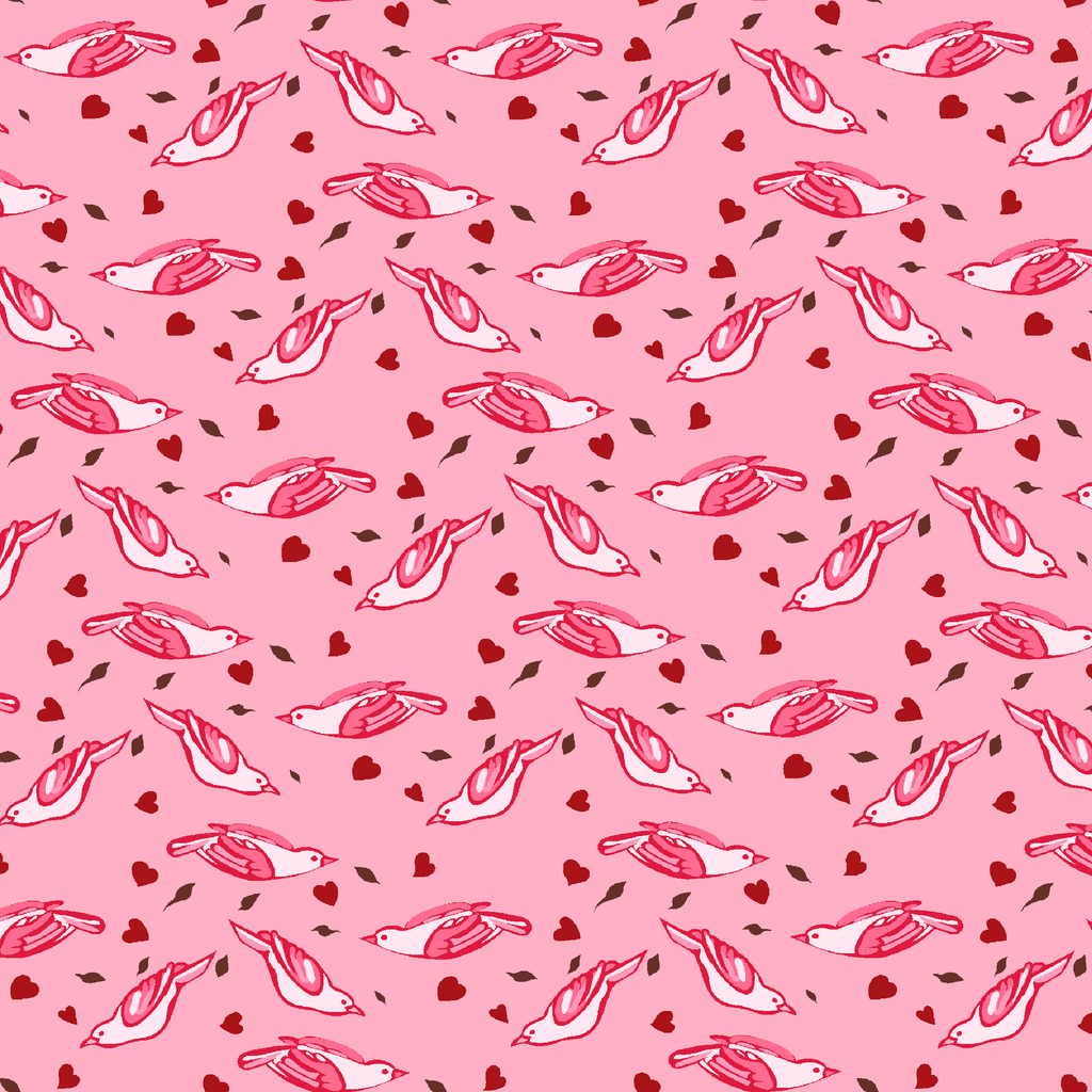Whimsical red and white birds are scattered across this charming pink background with hearts dispersed around them. Perfect for home decor or Valentine crafting projects with its romantic design.