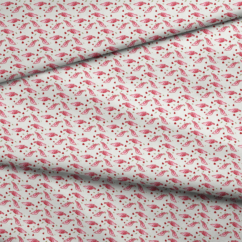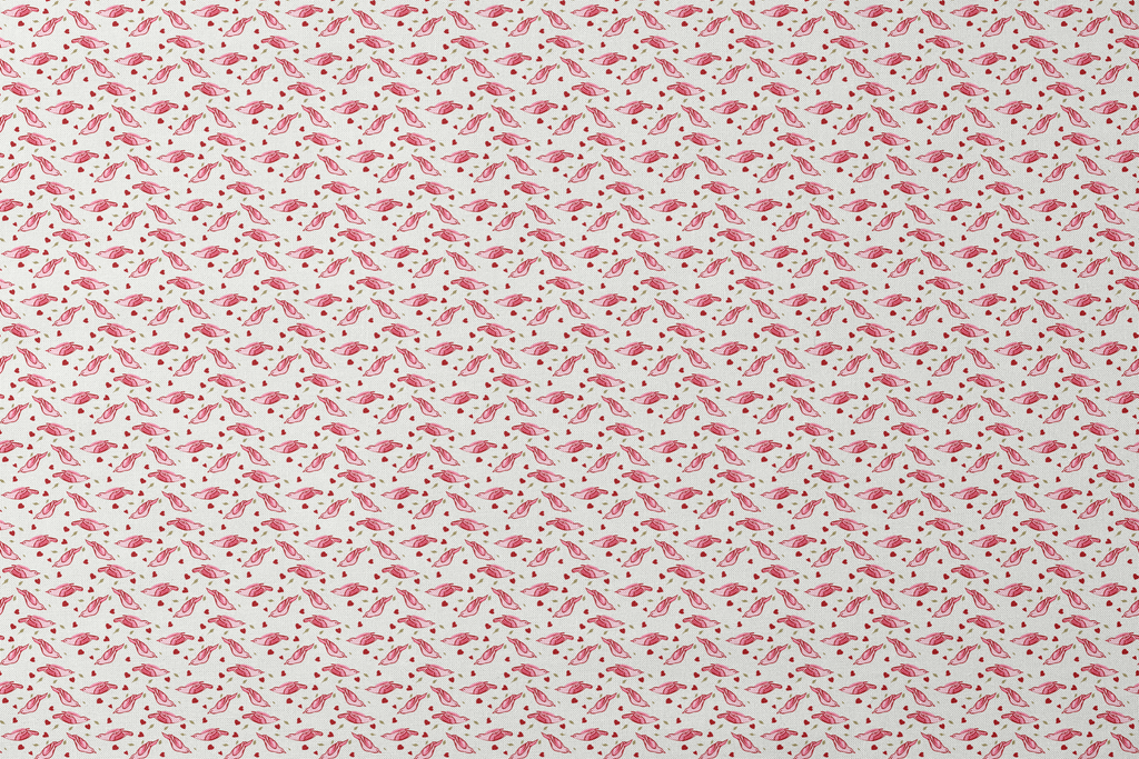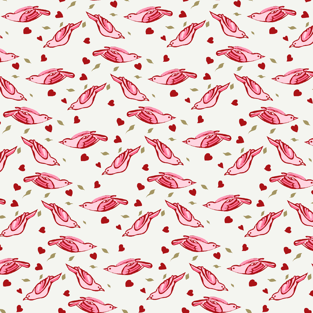 Whimsical red birds are scattered across this charming cream background with hearts dispersed around them. Perfect for home decor or Valentine crafting projects with its romantic design.