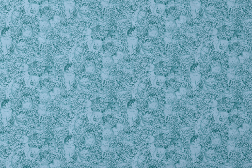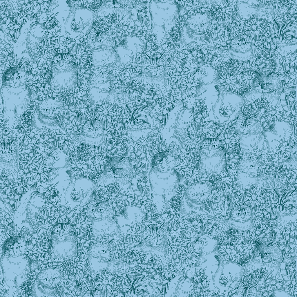 Vintage-inspired blue botanical pattern featuring delicate wildflowers and cat motifs in soft blue-green tones with romantic, whimsical charm. Perfect for cat lovers.