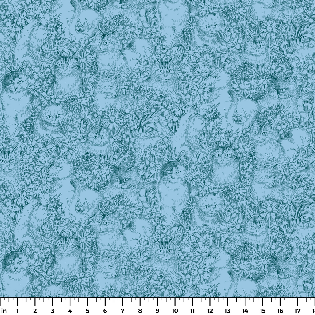 Floral Cat Sketch on Blue Fabric