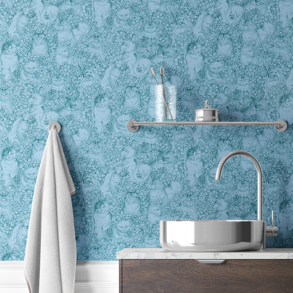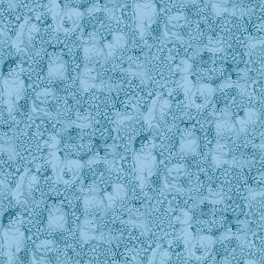 Whimsical blue botanical pattern featuring delicate floral and cat motifs in a vintage-inspired watercolor style perfect for cat lovers in any space.