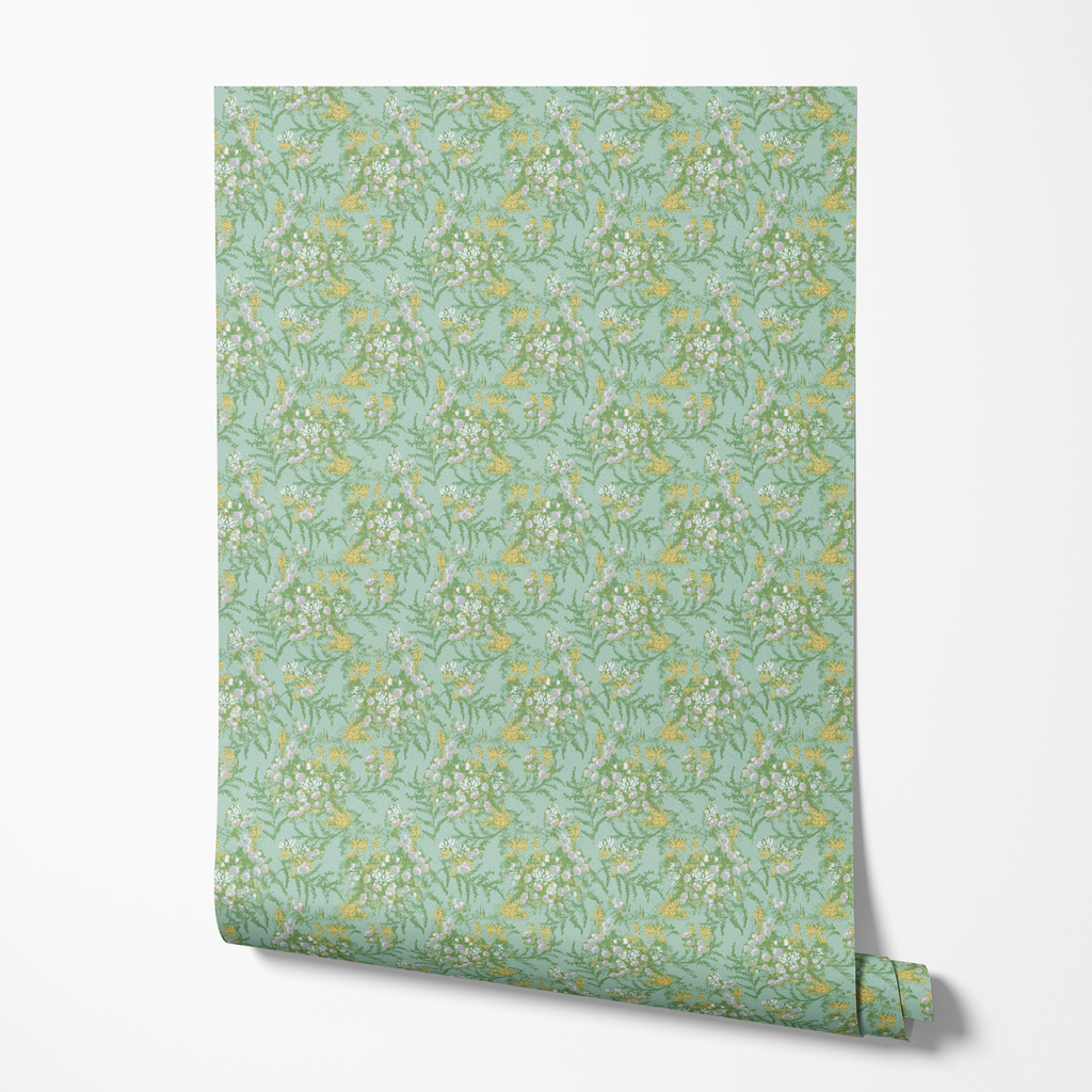 This delicate floral pattern features a soothing sage green background adorned with intricate fern-like greenery, white and lavender blooms, and touches of golden yellow accents for a fresh spring garden aesthetic.