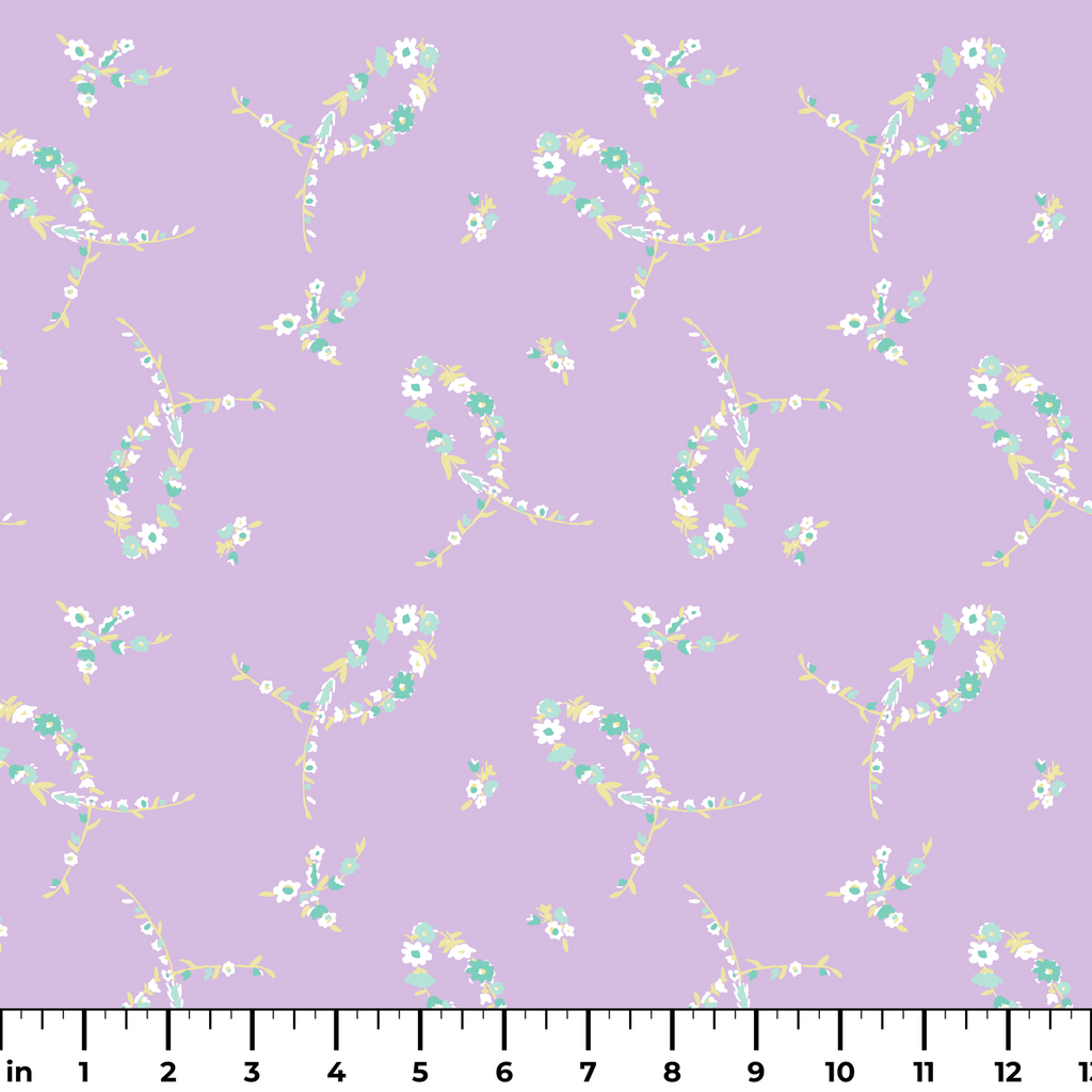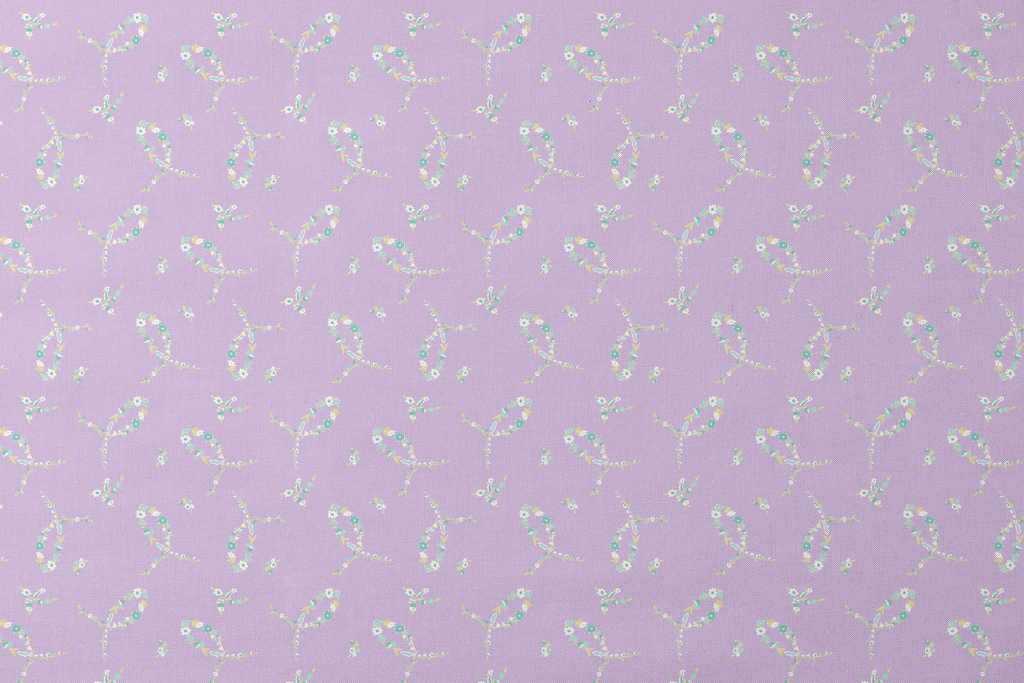 Delicate pastel floral sprigs dance across a soft lavender background, creating a whimsical, romantic pattern perfect for spring home decor or feminine apparel.