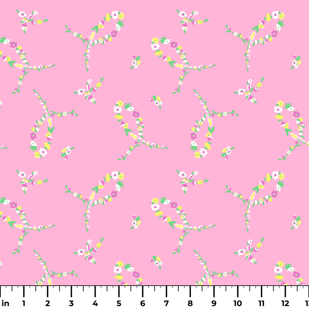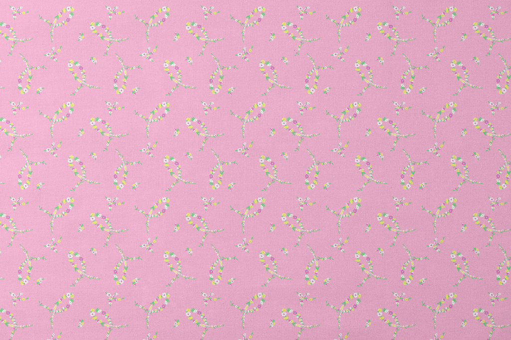 Delicate floral vines dance across a vibrant light pink background, creating a whimsical pattern perfect for springtime apparel or nursery decor.