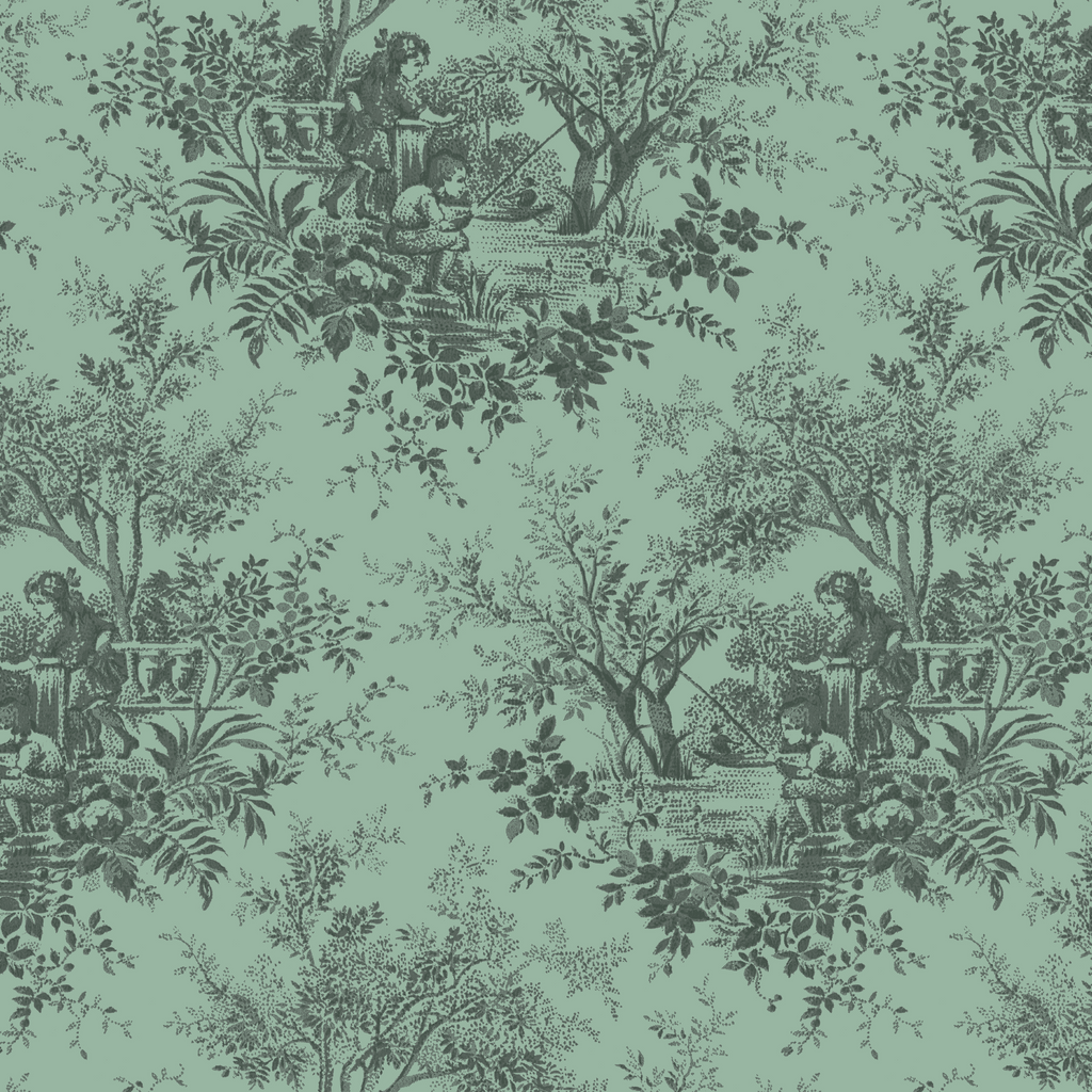 Minty green vintage-inspired french country toile featuring pastoral fishing scenes and lush botanicals.