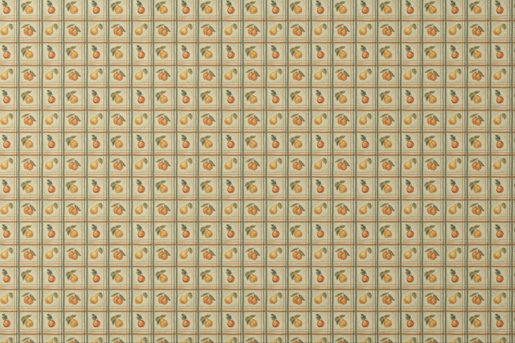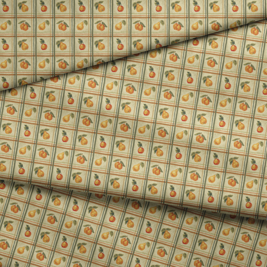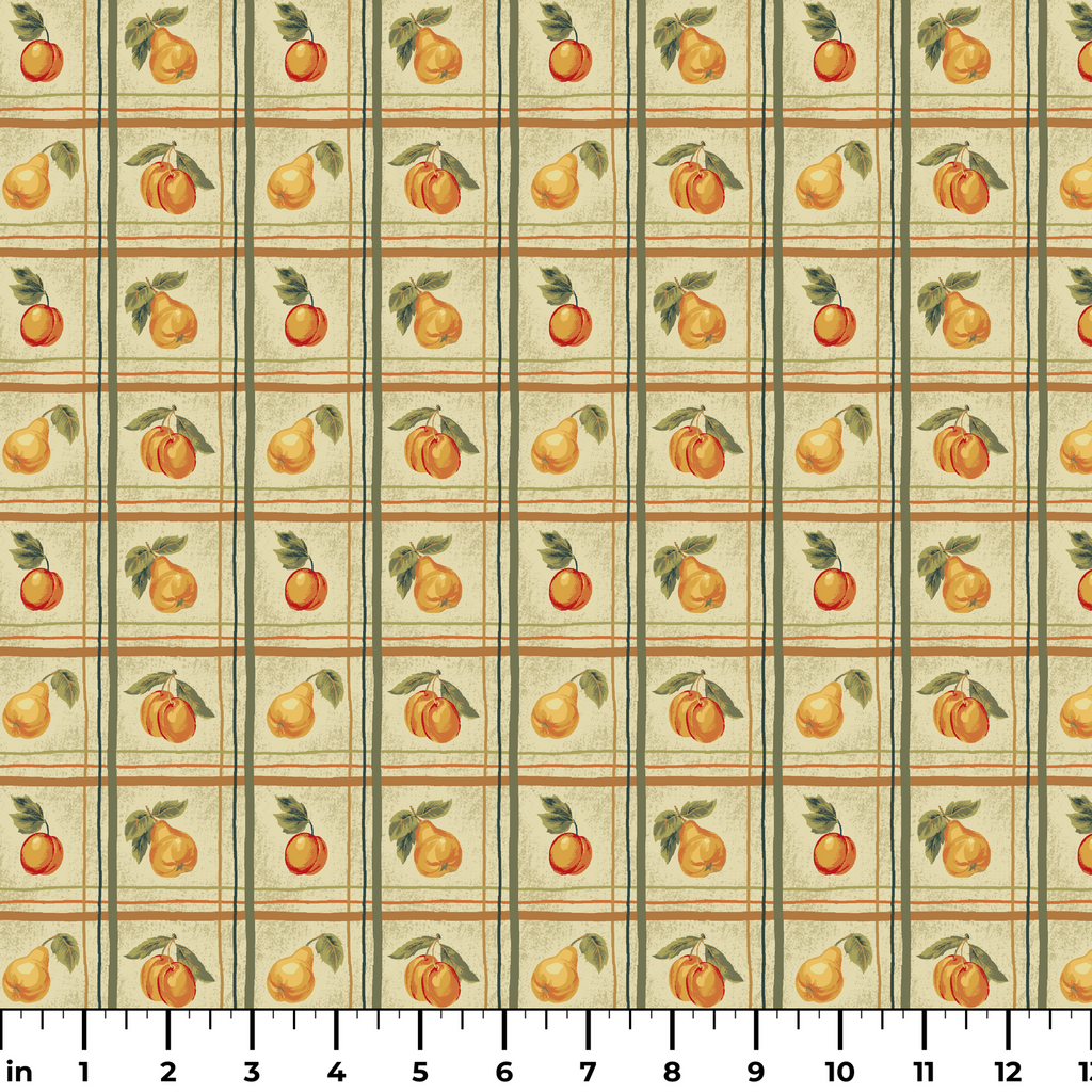 Vintage country kitchen plaid pattern featuring watercolor peaches and pears with green leaves on a cream background, perfect for rustic farmhouse kitchen.